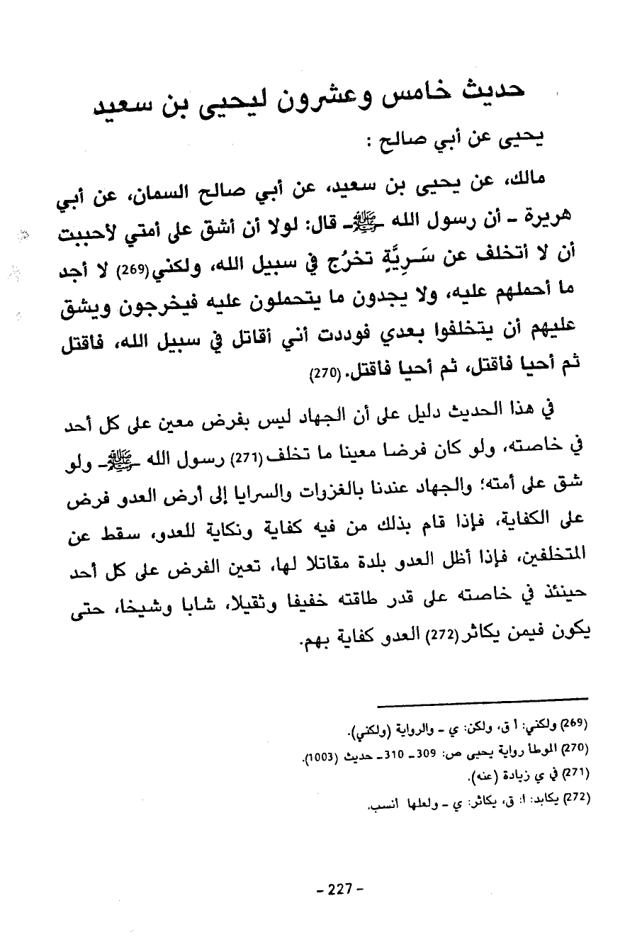 827 - مَالِكٌ عَنْ يَحْيَى بْنِ سَعِيدٍ عَنْ أَبِي صَالِحٍ السَّمَّانِ عَنْ أَبِي هُرَيْرَةَ أَنَّ رَسُولَ اللَّهِ صَلَّى اللَّهُ عَلَيْهِ وَسَلَّمَ قَالَ لَوْلَا أَنْ أَشُقَّ عَلَى أُمَّتِي لَأَحْبَبْتُ أَنْ لَا أَتَخَلَّفُ عَنْ سَرِيَّةٍ تَخْرُجُ فِي سَبِيلِ اللَّهِ وَلَكِنِّي لَا أَجِدُ مَا أَحْمِلُهُمْ عَلَيْهِ وَلَا يَجِدُونَ مَا يَتَحَمَّلُونَ عَلَيْهِ فيخرجون وييشق عَلَيْهِمْ أَنْ يَتَخَلَّفُوا بَعْدِي فَوَدِدْتُ أَنِّي أُقَاتِلُ فِي سَبِيلِ اللَّهِ فَأُقْتَلُ ثُمَّ أُحْيَا فَأُقْتَلُ ثُمَّ أُحْيَا فَأُقْتَلُ