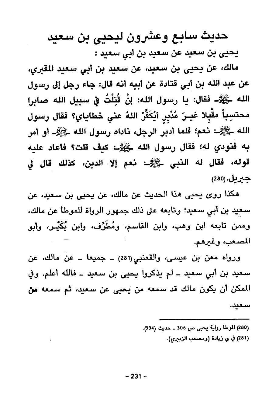 37037037 037 - مَالِكٌ عَنْ يَحْيَى بْنِ سَعِيدٍ عَنْ سَعِيدِ بْنِ أَبِي سَعِيدٍ الْمَقْبُرِيِّ عَنْ عَبْدُ اللَّهِ بْنُ أَبِي قَتَادَةَ عَنْ أَبِيهِ أَنَّهُ قَالَ جَاءَ رَجُلٌ إِلَى رَسُولِ اللَّهِ صَلَّى اللَّهُ عَلَيْهِ وَسَلَّمَ فَقَالَ يَا رَسُولَ اللَّهِ إِنْ قُتِلْتُ فِي سَبِيلِ اللَّهِ صَابِرًا مُحْتَسِبًا مُقْبِلًا غَيْرَ مُدْبِرٍ أَيُكَفِّرُ اللَّهُ عَنِّي خَطَايَايَ فَقَالَ رَسُولُ اللَّهِ صَلَّى اللَّهُ عَلَيْهِ وَسَلَّمَ نَعَمْ فَلَمَّا أَدْبَرَ الرَّجُلُ نَادَاهُ رَسُولِ اللَّهِ صَلَّى اللَّهُ عَلَيْهِ وَسَلَّمَ أَوْ أَمَرَ بِهِ فَنُودِيَ لَهُ فَقَالَ رَسُولُ اللَّهِ صَلَّى اللَّهُ عَلَيْهِ وَسَلَّمَ كَيْفَ قُلْتَ فَأَعَادَ عَلَيْهِ قَوْلَهُ فَقَالَ لَهُ النَّبِيُّ صَلَّى اللَّهُ عَلَيْهِ وَسَلَّمَ نَعَمْ إِلَّا الدَّيْنَ كَذَلِكَ قَالَ لِي جِبْرِيلُ