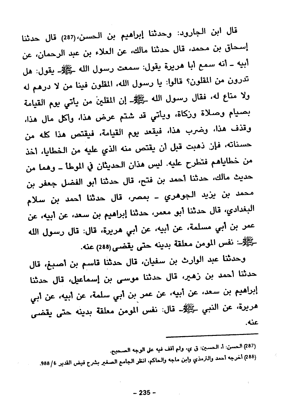 قَالَ ابْنُ الْجَارُودِ وَحَدَّثَنَا إِبْرَاهِيمُ بْنُ الْحَسَنِ قَالَ حَدَّثَنَا إِسْحَاقُ بْنُ مُحَمَّدٍ قَالَ حَدَّثَنَا مَالِكٌ عَنِ الْعَلَاءِ بْنِ عَبْدِ الرَّحْمَنِ عَنْ أَبِيهِ أَنَّهُ سَمِعَ أَبَا هُرَيْرَةَ يَقُولُ سَمِعْتُ رَسُولَ اللَّهِ صَلَّى اللَّهُ عَلَيْهِ وسلم يقول هَلْ تَدْرُونَ مَنِ الْمُقِلُّونَ قَالُوا يَا رَسُولَ اللَّهِ الْمُقِلُّونَ فِينَا مَنْ لَا دِرْهَمَ لَهُ وَلَا مَتَاعَ لَهُ فَقَالَ رَسُولُ اللَّهِ صَلَّى اللَّهُ عَلَيْهِ وَسَلَّمَ إِنَّ الْمُقِلِّينَ مَنْ يَأْتِي يَوْمَ الْقِيَامَةِ بِصِيَامٍ وَصَلَاةٍ وَزَكَاةٍ وَيَأْتِي قَدْ شَتَمَ عِرْضَ هَذَا وَأَكَلَ مَالَ هَذَا وَقَذَفَ هَذَا وَضَرَبَ هَذَا فَيَقْعُدُ يَوْمَ الْقِيَامَةِ فَيُقْتَصُّ هَذَا كُلُّهُ مِنْ حَسَنَاتِهِ فَإِنْ ذَهَبَتْ قَبْلَ أَنْ يُقْتَصَّ مِنْهُ الَّذِي عَلَيْهِ مِنَ الْخَطَايَا أُخِذَ مِنْ خَطَايَاهُمْ فَتُطْرَحُ عَلَيْهِ