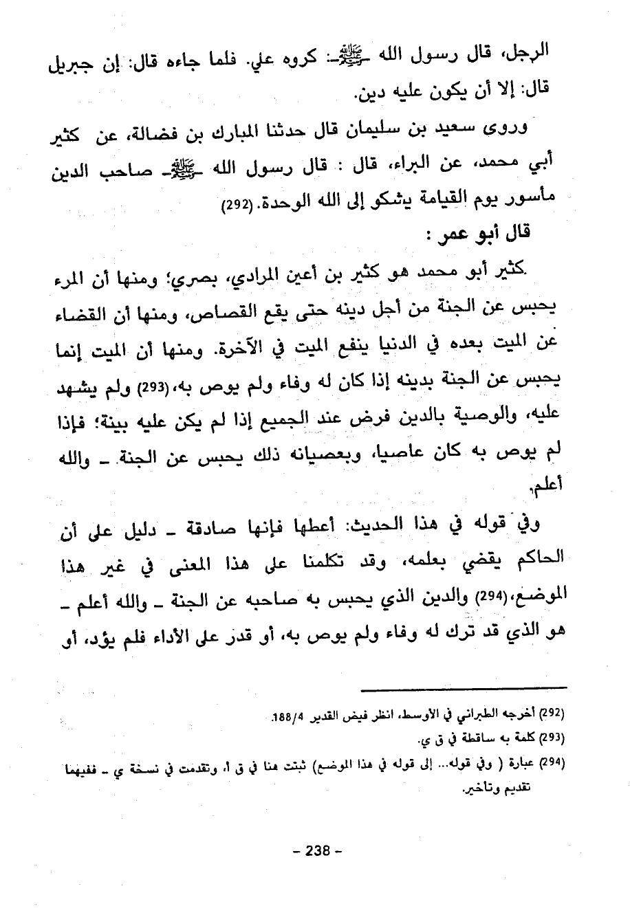 قَالَ أَبُو عُمَرَ كثير أو مُحَمَّدٍ هُوَ كَثِيرُ بْنُ أَعْيَنَ الْمُرَادِيُّ بَصْرِيٌّ وَمِنْهَا أَنَّ الْمَرْءَ يُحْبَسُ عَنِ الْجَنَّةِ مِنْ أَجْلِ دَيْنِهِ حَتَّى يَقَعَ الْقِصَاصُ وَمِنْهَا أَنَّ الْقَضَاءَ عَنِ الْمَيِّتِ بَعْدَهُ فِي الدُّنْيَا يَنْفَعُ الْمَيِّتَ فِي الْآخِرَةِ وَمِنْهَا أَنَّ الْمَيِّتَ إِنَّمَا يُحْبَسُ عَنِ الْجَنَّةِ بِدَيْنِهِ إِذَا كَانَ لَهُ وَفَاءٌ وَلَمْ يُوصِ بِهِ وَلَمْ يُشْهِدْ عَلَيْهِ وَالْوَصِيَّةُ بِالدَّيْنِ فَرْضٌ عِنْدَ الْجَمِيعِ إِذَا لَمْ يَكُنْ عَلَيْهِ بَيِّنَةٌ فَإِذَا لَمْ يُوصِ بِهِ كَانَ عَاصِيًا وَبِعِصْيَانِهِ ذَلِكَ يُحْبَسُ عَنِ الْجَنَّةِ وَاللَّهُ أَعْلَمُ