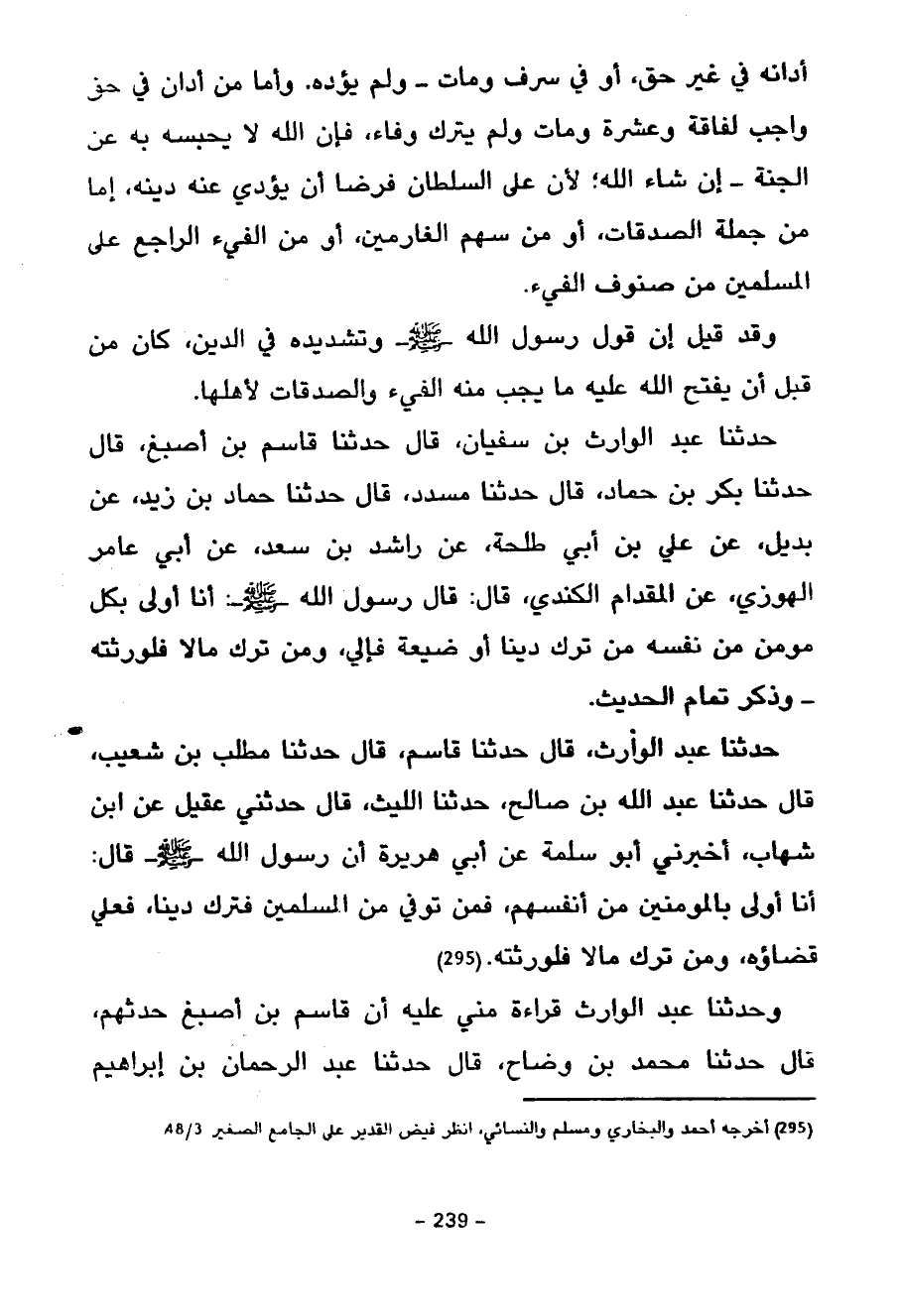 حَدَّثَنَا عَبْدُ الْوَارِثِ بْنُ سُفْيَانَ قَالَ حَدَّثَنَا قَاسِمُ بْنُ أَصْبَغَ قَالَ حَدَّثَنَا بَكْرُ بْنُ حَمَّادٍ قَالَ حَدَّثَنَا مُسَدَّدٌ قَالَ حَدَّثَنَا حَمَّادُ بْنُ زَيْدٍ عَنْ بُدَيْلٍ عَنْ عَلِيِّ بْنِ أَبِي طَلْحَةَ عَنْ رَاشِدِ بْنِ سَعْدٍ عَنْ أَبِي عَامِرٍ الْهَوْزِيِّ عَنِ الْمِقْدَامِ الْكِنْدِيِّ قَالَ قَالَ رَسُولُ اللَّهِ صَلَّى اللَّهُ عَلَيْهِ وَسَلَّمَ أَنَا أَوْلَى بكل مؤمن مِنْ نَفْسِهِ مَنْ تَرَكَ دَيْنًا أَوْ ضَيْعَةً فَإِلَيَّ وَمَنْ تَرَكَ مَالَا فَلِوَرَثَتِهِ وَذَكَرَ تَمَامَ الْحَدِيثِ