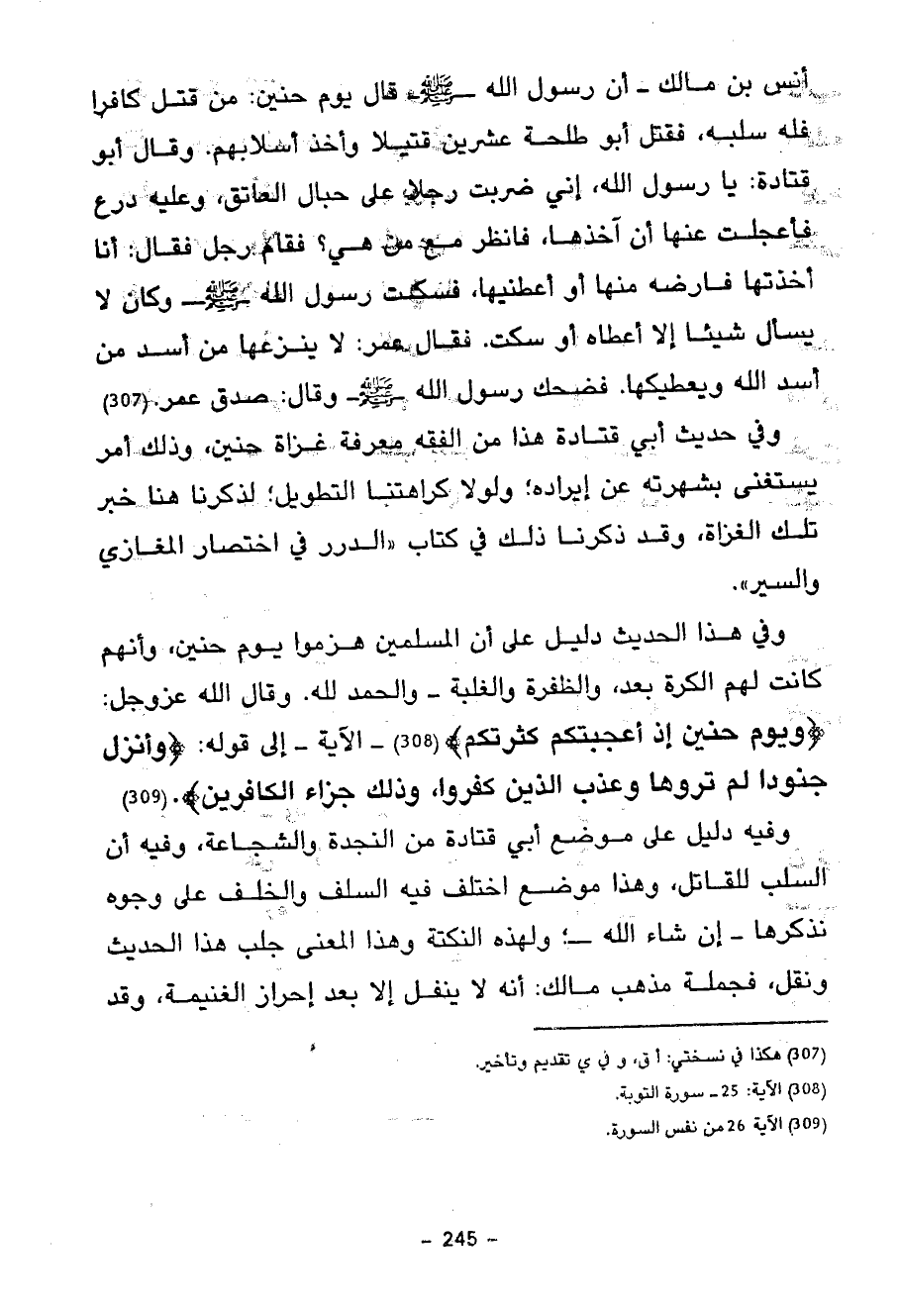 وَفِي حَدِيثِ أَبِي قَتَادَةَ هذا من الفقه معرفة غزاة حنين وذكل أَمْرٌ يُسْتَغْنَى بِشُهْرَتِهِ عَنْ إِيرَادِهِ وَلَوْلَا كَرَاهَتُنَا التَّطْوِيلَ لَذَكَرْنَا هُنَا خَبَرَ تِلْكَ الْغَزَاةِ وَقَدْ ذَكَرْنَا ذَلِكَ فِي كِتَابِ الدُّرَرِ فِي اخْتِصَارِ المغازي والسير