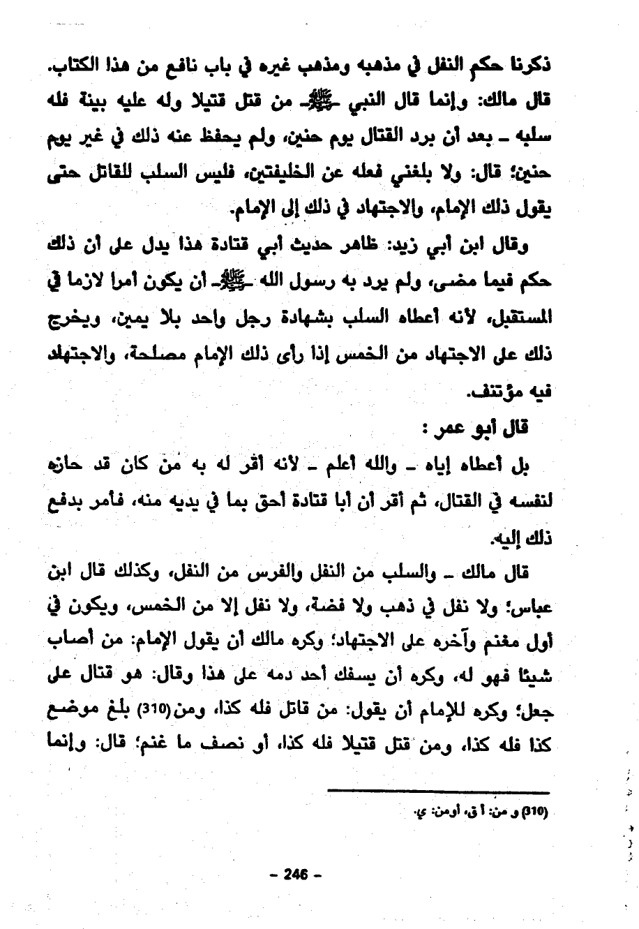 قَالَ مالك وإنما قال النبي مَنْ قَتَلَ قَتِيلًا وَلَهُ عَلَيْهِ بَيِّنَةٌ فَلَهُ سَلَبُهُ بَعْدَ أَنْ بَرَدَ الْقِتَالُ يَوْمَ حُنَيْنٍ وَلَمْ يُحْفَظْ عَنْهُ ذَلِكَ فِي غَيْرِ يَوْمِ حنين قال ولا بلغني فعله على الْخَلِيفَتَيْنِ فَلَيْسَ السَّلَبُ لِلْقَاتِلِ حَتَّى يَقُولَ ذَلِكَ الْإِمَامُ وَالِاجْتِهَادُ فِي ذَلِكَ إِلَى الْإِمَامِ