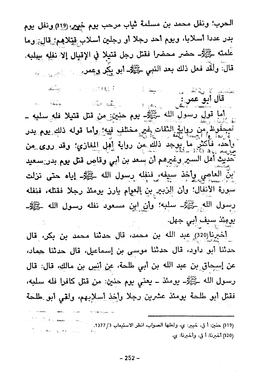 قَالَ أَبُو عُمَرَ أَمَّا قَوْلُ رَسُولِ الله يَوْمَ حُنَيْنٍ مَنْ قَتَلَ قَتِيلًا فَلَهُ سَلَبُهُ فَمَحْفُوظٌ مِنْ رِوَايَةِ الثِّقَاتِ غَيْرُ مُخْتَلَفٍ فِيهِ وَأَمَّا قَوْلُهُ ذَلِكَ يَوْمَ بَدْرٍ وَأُحُدٍ فَأَكْثَرُ مَا يُوجَدُ ذَلِكَ فِي رِوَايَةِ أَهْلِ الْمَغَازِي وَقَدْ رُوِيَ مِنْ حَدِيثِ أَهْلِ السِّيَرِ وَغَيْرِهِمْ أَنَّ سَعْدَ بْنَ أَبِي وَقَّاصٍ قَتَلَ يَوْمَ بدر سعيد بن العاصي وأخد سيفه فنفله رسول الله إِيَّاهُ حَتَّى نَزَلَتْ سُورَةُ الْأَنْفَالِ وَأَنَّ الزُّبَيْرَ بْنَ الْعَوَّامِ بَارَزَ يَوْمَئِذٍ رَجُلًا فَقَتَلَهُ فَنَفَّلَهُ رسول الله سَلَبَهُ وَأَنَّ ابْنَ مَسْعُودٍ نَفَّلَهُ رَسُولُ اللَّهِ يَوْمَئِذٍ سَيْفَ أَبِي جَهْلٍ
