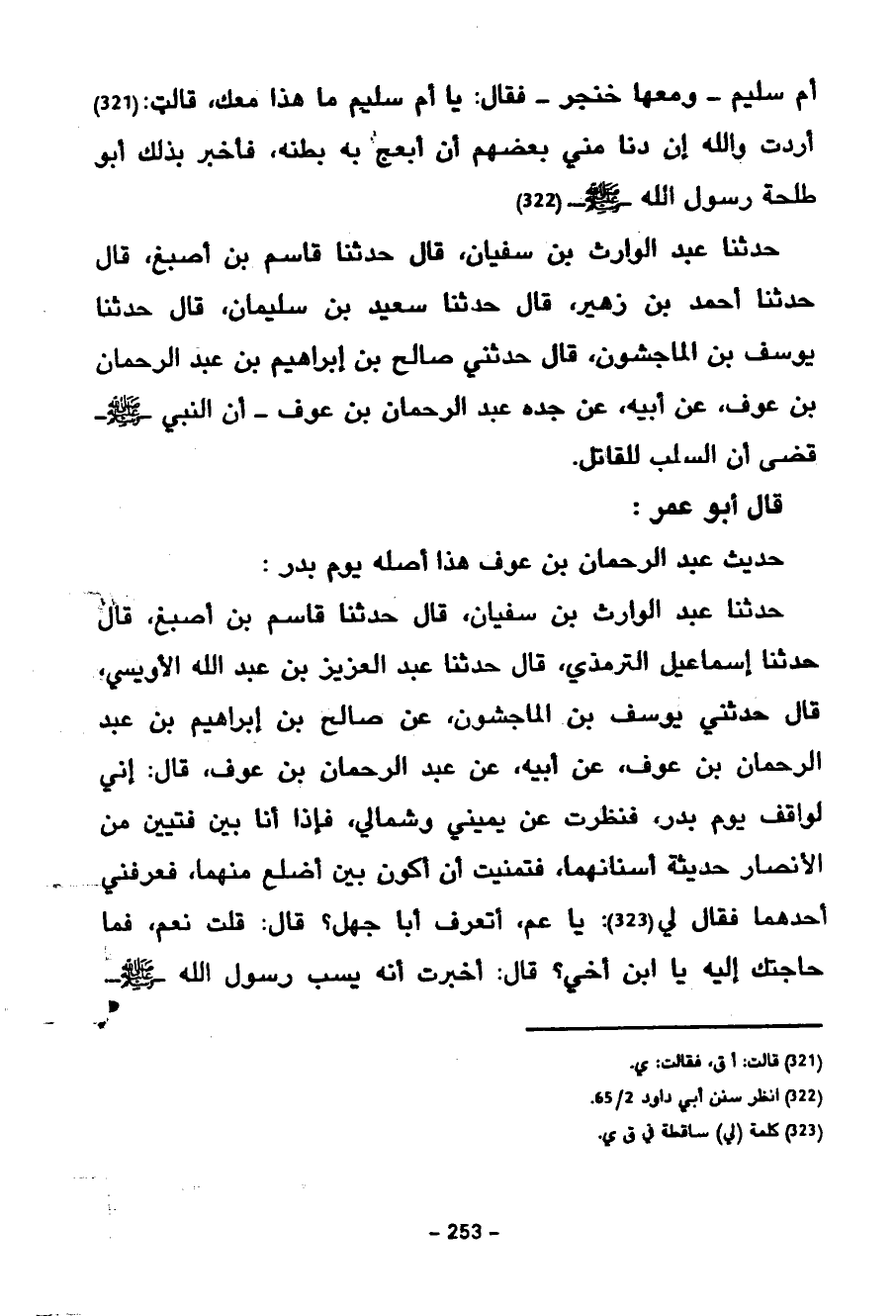 حَدَّثَنَا عَبْدُ الْوَارِثِ بْنُ سُفْيَانَ قَالَ حَدَّثَنَا قَاسِمُ بْنُ أَصْبَغَ قَالَ حَدَّثَنَا إِسْمَاعِيلَ التِّرْمِذِيُّ قَالَ حَدَّثَنَا عَبْدُ الْعَزِيزِ بْنُ عَبْدِ اللَّهِ الْأُوَيْسِيُّ قَالَ حَدَّثَنِي يُوسُفُ بْنُ الْمَاجِشُونِ عَنْ صَالِحِ بْنِ إِبْرَاهِيمَ بْنِ عَبْدِ الرَّحْمَنِ بْنِ عَوْفٍ عَنْ أَبِيهِ عَنْ عَبْدِ الرَّحْمَنِ بْنِ عَوْفٍ قَالَ إِنِّي لَوَاقِفٌ يَوْمَ بَدْرٍ فَنَظَرْتُ عَنْ يَمِينِي وَشِمَالِي فَإِذَا أَنَا بَيْنَ فَتَيَيْنِ مِنَ الْأَنْصَارِ حَدِيثَةٍ أَسْنَانُهُمَا فَتَمَنَّيْتُ أَنْ أَكُونَ بَيْنَ أَضْلَعَ مِنْهُمَا فَعَرَفَنِي أَحَدُهُمَا فَقَالَ لِي يَا عَمِّ أَتَعْرِفُ أَبَا جَهْلٍ قَالَ قُلْتُ نَعَمْ فَمَا حَاجَتُكَ إِلَيْهِ يَا ابْنَ أَخِي قَالَ أُخْبِرْتُ أَنَّهُ يَسُبُّ رَسُولَ اللَّهِ صَلَّى اللَّهُ عَلَيْهِ وَسَلَّمَ