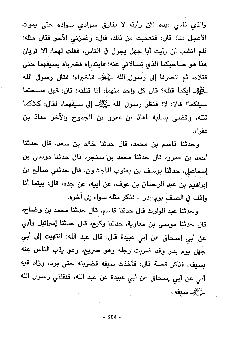 وَالَّذِي نَفْسِي بِيَدِهِ لَئِنْ رَأَيْتُهُ لَا يُفَارِقُ سَوَادِي سَوَادَهُ حَتَّى يَمُوتَ الْأَعْجَلُ مِنَّا قَالَ فَتَعَجَّبْتُ مِنْ ذَلِكَ قَالَ وَغَمَزَنِي الْآخَرُ فَقَالَ مِثْلَهُ فَلَمْ أَنْشَبَ أَنْ رَأَيْتُ أَبَا جَهْلٍ يَجُولُ فِي النَّاسِ فَقُلْتُ لَهُمَا أَلَا تَرَيَانِ هَذَا هُوَ صَاحِبُكُمَا الَّذِي تَسْأَلَانِي عَنْهُ فَابْتَدَرَاهُ فَضَرَبَاهُ بِسَيْفِهِمَا حَتَّى قَتَلَاهُ ثُمَّ انْصَرَفَا إِلَى رسول الله فأخبراه فقال رسول الله أَيُّكُمَا قَتَلَهُ قَالَ كُلُّ وَاحِدٍ مِنْهُمَا أَنَا قَتَلْتُهُ قَالَ فَهَلْ مَسَحْتُمَا سَيْفَكُمَا قَالَا لَا فنظر رسول الله إِلَى سَيْفِهِمَا فَقَالَ كِلَاكُمَا قَتَلَهُ وَقَضَى بِسَلَبِهِ لِمُعَاذِ بْنِ عَمْرِو بْنِ الْجَمُوحِ وَالْآخَرُ مُعَاذُ بْنُ عَفْرَاءَ