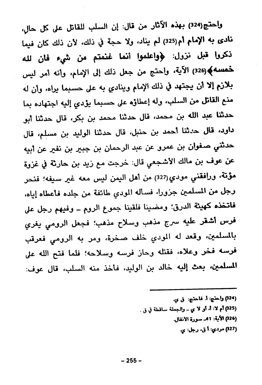 وَاحْتَجَّ بِهَذِهِ الْآثَارِ مَنْ قَالَ إِنَّ السَّلَبَ لِلْقَاتِلِ عَلَى كُلِّ حَالٍ نَادَى بِهِ الْإِمَامُ أَمْ لَمْ يُنَادِ وَلَا حُجَّةَ فِي ذَلِكَ لِأَنَّ ذَلِكَ كَانَ فِيمَا ذَكَرُوا قَبْلَ نُزُولِ وَاعْلَمُوا أَنَّمَا غَنِمْتُمْ مِنْ شَيْءٍ فَأَنَّ لِلَّهِ خُمُسَهُ الْآيَةَ وَاحْتَجَّ مَنْ جَعَلَ ذَلِكَ إِلَى الْإِمَامِ وَأَنَّهُ أَمْرٌ لَيْسَ بِلَازِمٍ إِلَّا أَنْ يَجْتَهِدَ فِي ذَلِكَ الْإِمَامُ وَيُنَادِيَ بِهِ عَلَى حَسْبَمَا يَرَاهُ وَأَنَّ لَهُ مَنْعَ الْقَاتِلِ مِنَ السَّلَبِ وَلَهُ إِعْطَاؤُهُ عَلَى حَسْبَمَا يُؤَدِّي إِلَيْهِ اجْتِهَادُهُ بِمَا حَدَّثَنَا عَبْدُ اللَّهِ بْنُ مُحَمَّدٍ قَالَ حَدَّثَنَا مُحَمَّدُ بْنُ بَكْرٍ قَالَ حَدَّثَنَا أَبُو دَاوُدَ قَالَ حَدَّثَنَا أَحْمَدُ بْنُ حَنْبَلٍ قَالَ حَدَّثَنَا الْوَلِيدُ بْنُ مُسْلِمٍ قَالَ حَدَّثَنِي صَفْوَانَ بْنِ عَمْرٍو عَنْ عَبْدِ الرَّحْمَنِ بْنِ جُبَيْرِ بْنِ نُفَيْرٍ عَنْ أَبِيهِ عَنْ عَوْفِ بْنِ مَالِكٍ الْأَشْجَعِيِّ قَالَ خَرَجْتُ مَعَ زَيْدِ بْنِ حَارِثَةَ فِي غَزْوَةِ مُؤْتَةَ وَرَافَقَنِي مُوْدِيٌّ مِنْ أَهْلِ الْيَمَنِ لَيْسَ مَعَهُ غَيْرُ سَيْفِهِ فَنَحَرَ رَجُلٌ مِنَ الْمُسْلِمِينَ جَزُورًا فَسَأَلَهُ الْمُودِيُّ طَائِفَةً مِنْ جِلْدِهِ فَأَعْطَاهُ إِيَّاهُ فَاتَّخَذَهُ كَهَيْئَةِ الدَّرَقِ وَمَضَيْنَا فَلَقِينَا جُمُوعَ الرُّومِ وَفِيهِمْ رَجُلٌ عَلَى فَرَسٍ أَشْقَرَ عَلَيْهِ سَرْجٌ مُذَهَّبٌ وَسِلَاحٌ مُذَهَّبٌ فَجَعَلَ الرُّومِيُّ يُغْرِي بِالْمُسْلِمِينَ وَقَعَدَ لَهُ الْمُودِيُّ خَلْفَ صَخْرَةٍ وَمَرَّ بِهِ الرُّومِيُّ فَعَرْقَبَ فَرَسَهُ فَخَرَّ وَعَلَاهُ فَقَتَلَهُ وَحَازَ فَرَسَهُ وَسِلَاحَهُ فلما فتح الله على المسلمين بعد إِلَيْهِ خَالِدُ بْنُ الْوَلِيدِ فَأَخَذَ مِنْهُ السَّلَبَ قال عوف