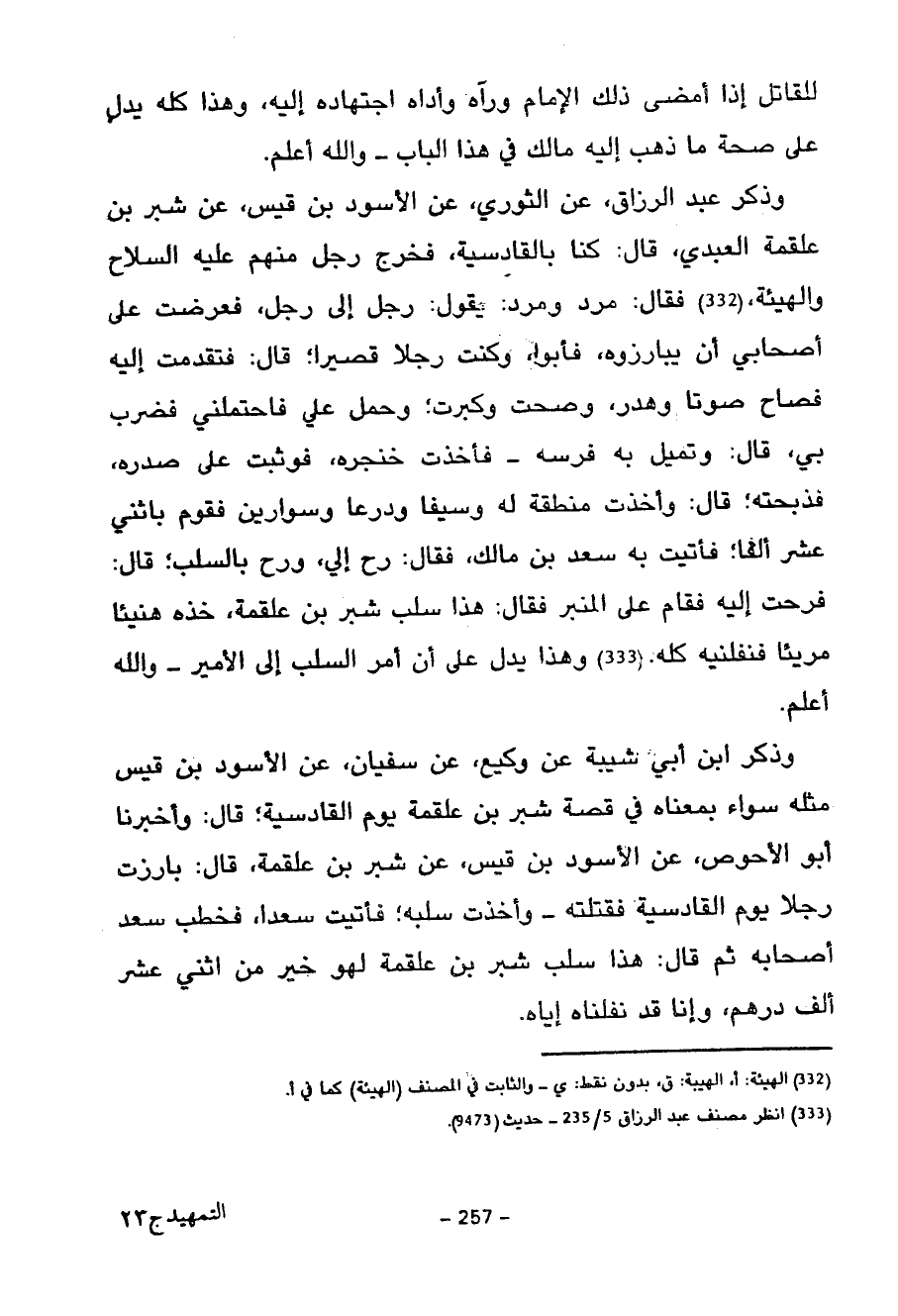 وَذَكَرَ ابْنُ أَبِي شَيْبَةَ عَنْ وَكِيعٍ عَنْ سُفْيَانَ عَنِ الأسود بن قيس مثله سواء بِمَعْنَاهُ فِي قِصَّةِ شِبْرِ بْنِ عَلْقَمَةَ يَوْمَ الْقَادِسِيَّةِ قَالَ وَأَخْبَرَنَا أَبُو الْأَحْوَصِ عَنِ الْأَسْوَدِ بْنِ قَيْسٍ عَنْ شِبْرِ بْنِ عَلْقَمَةَ قَالَ بَارَزْتُ رَجُلًا يَوْمَ الْقَادِسِيَّةِ فَقَتَلْتُهُ وَأَخَذْتُ سَلَبَهُ فَأَتَيْتُ سَعْدًا فَخَطَبَ سَعْدٌ أَصْحَابَهُ ثُمَّ قَالَ هَذَا سَلَبُ شِبْرِ بْنِ عَلْقَمَةَ لَهُوَ خَيْرٌ مِنِ اثْنَيْ عَشَرَ أَلْفَ دِرْهَمٍ وَإِنَّا قَدْ نفلناه إياه
