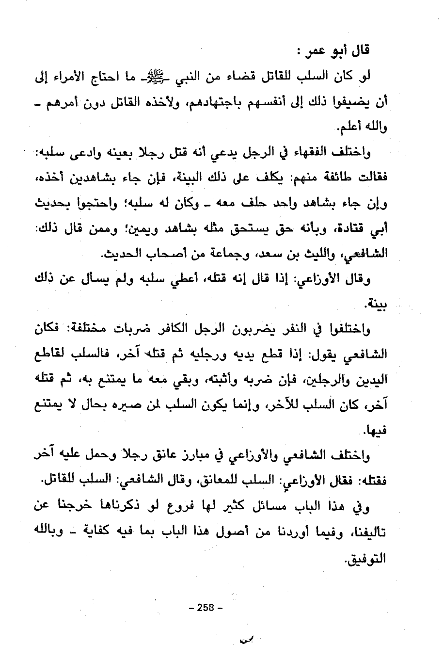 قَالَ أَبُو عُمَرَ لَوْ كَانَ السَّلَبُ لِلْقَاتِلِ قضاء من النبي مَا احْتَاجَ الْأُمَرَاءُ إِلَى أَنْ يُضِيفُوا ذَلِكَ إِلَى أَنْفُسِهِمْ بِاجْتِهَادِهِمْ وَلَأَخَذَهُ الْقَاتِلُ دُونَ أَمْرِهِمْ وَاللَّهُ أَعْلَمُ