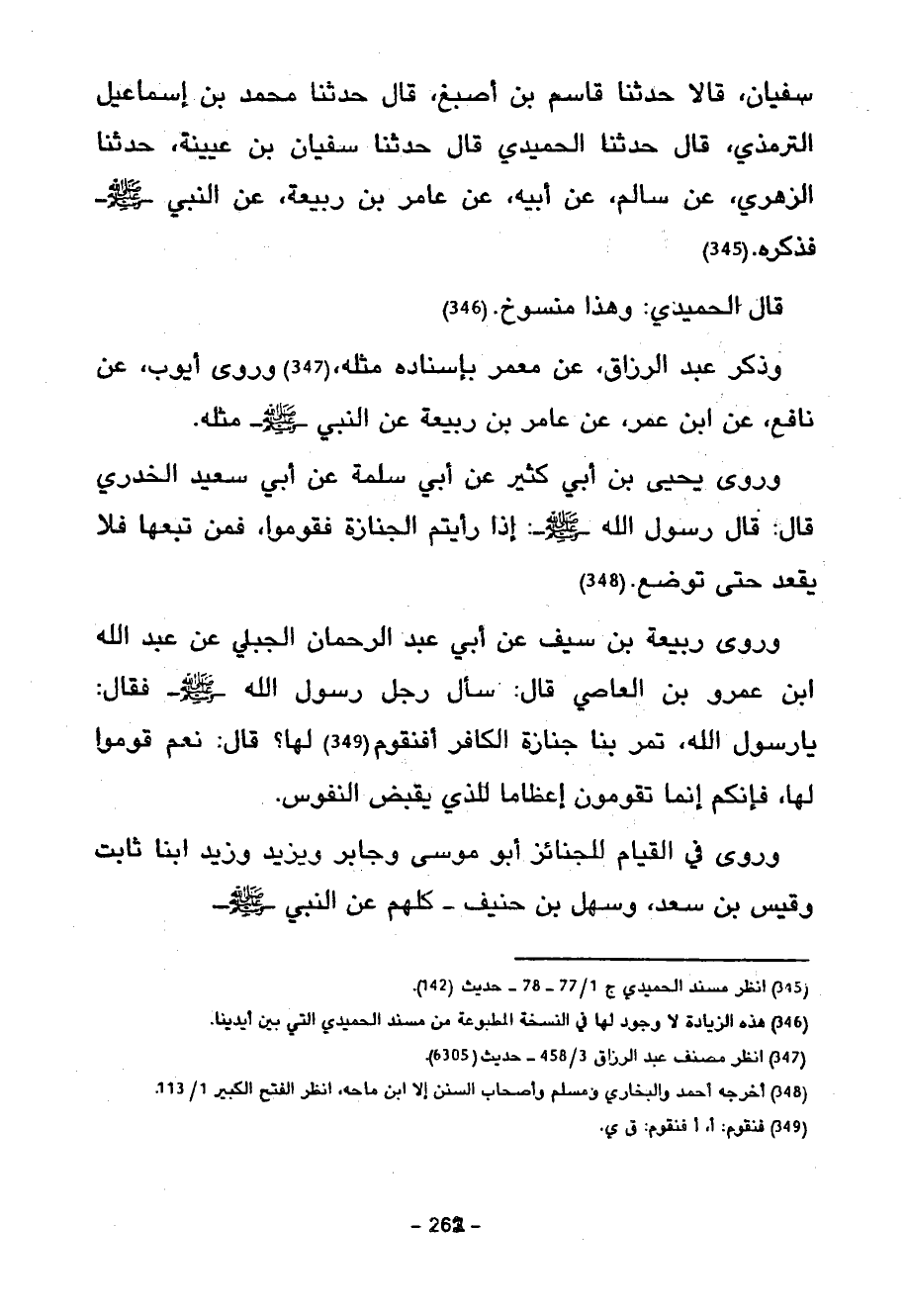 وَرَوَى فِي الْقِيَامِ لِلْجَنَائِزِ أَبُو مُوسَى وَجَابِرٌ وَيَزِيدُ وَزَيْدٌ ابْنَا ثَابِتٍ وَقَيْسُ بْنُ سَعْدٍ وَسَهْلُ بْنُ حُنَيْفٍ كُلُّهُمْ عَنِ النَّبِيِّ صَلَّى اللَّهُ عَلَيْهِ وَسَلَّمَ