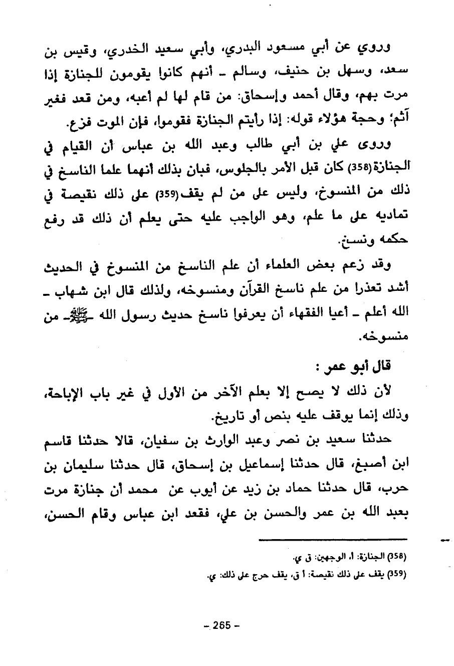 وَرَوَى عَلِيِّ بْنِ أَبِي طَالِبٍ وَعَبْدِ اللَّهِ بْنِ عَبَّاسٍ أَنَّ الْقِيَامَ فِي الْجِنَازَةِ كَانَ قَبْلَ الْأَمْرِ بِالْجُلُوسِ فَبَانَ بِذَلِكَ أَنَّهُمَا عَلِمَا النَّاسِخَ فِي ذَلِكَ مِنَ الْمَنْسُوخِ وَلَيْسَ عَلَى مَنْ لَمْ يَقِفْ عَلَى ذَلِكَ نَقِيصَةٌ في تماديه على ما علم وهوالواجب عَلَيْهِ حَتَّى يَعْلَمَ أَنَّ ذَلِكَ قَدْ رُفِعَ حُكْمُهُ وَنُسِخَ
