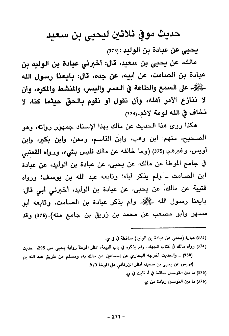 هَكَذَا رَوَى هَذَا الْحَدِيثَ عَنْ مَالِكٍ بِهَذَا الْإِسْنَادِ جُمْهُورُ رُوَاتِهِ وَهُوَ الصَّحِيحُ مِنْهُمُ ابْنُ وَهْبٍ وَابْنُ الْقَاسِمِ وَمَعْنٌ وَابْنُ بُكَيْرٍ وَابْنُ أُوَيْسٍ وَغَيْرُهُمْ وما خالفه عن مالك فليس بشيء ورواه القعنبي فِي جَامِعِ الْمُوَطَّأِ عَنْ مَالِكٍ عَنْ يَحْيَى عَنْ عُبَادَةَ بْنِ الْوَلِيدِ عَنْ عُبَادَةَ بْنِ الصَّامِتِ وَلَمْ يَذْكُرْ أَبَاهُ وَتَابَعَهُ عَبْدُ اللَّهِ بْنُ يُوسُفَ وَرَوَاهُ قُتَيْبَةُ عَنْ مَالِكٍ عَنْ يَحْيَى عَنْ عُبَادَةَ بْنِ الْوَلِيدِ أَخْبَرَنِي أَبِي قال بايعنا رسول الله وَلَمْ يَذْكُرْ عُبَادَةَ بْنَ الصَّامِتِ وَتَابَعَهُ أَبُو مُسْهِرٍ وَأَبُو مُصْعَبٍ عَنْ مُحَمَّدِ بْنِ زُرَيْقِ بْنِ جَامِعٍ مِنْهُ