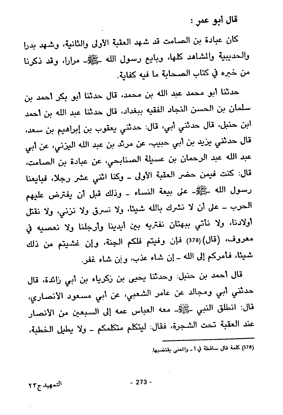 حَدَّثَنَا أَبُو مُحَمَّدٍ عَبْدُ اللَّهِ بْنُ مُحَمَّدِ قَالَ حَدَّثَنَا أَبُو بَكْرٍ أَحْمَدُ بْنُ سَلْمَانَ بْنِ الْحَسَنِ النَّجَّادُ الْفَقِيهُ بِبَغْدَادَ قَالَ حَدَّثَنَا عَبْدُ اللَّهِ بْنُ أَحْمَدَ بْنِ حَنْبَلٍ قَالَ حَدَّثَنِي أَبِي قَالَ حَدَّثَنِي يَعْقُوبُ بْنُ إِبْرَاهِيمَ بْنِ سَعْدٍ قَالَ حَدَّثَنِي يَزِيدُ بْنُ أَبِي حَبِيبٍ عَنْ مَرْثَدِ بْنِ عَبْدِ اللَّهِ الْيَزَنِيِّ عَنْ أَبِي عَبْدِ اللَّهِ عَبْدِ الرَّحْمَنِ بْنِ عُسَيْلَةَ الصُّنَابِحِيِّ عَنْ عُبَادَةَ بْنِ الصَّامِتِ قَالَ كُنَّا فِيمَنْ حَضَرَ العقبة الْأُولَى وَكُنَّا اثْنَيْ عَشَرَ رَجُلًا فَبَايَعْنَا رَسُولَ الله عَلَى بَيْعَةِ النِّسَاءِ وَذَلِكَ قَبْلَ أَنْ يُفْتَرَضَ عَلَيْهِمُ الْحَرْبُ عَلَى أَنْ لَا نُشْرِكَ بِاللَّهِ شَيْئًا وَلَا نشرق وَلَا نَزْنِي وَلَا نَقْتُلَ أَوْلَادَنَا وَلَا نَأْتِيَ بِبُهْتَانٍ نَفْتَرِيهِ بَيْنَ أَيْدِينَا وَأَرْجُلِنَا وَلَا نَعْصِيهِ فِي مَعْرُوفٍ قَالَ فَإِنْ وَفَّيْتُمْ فَلَكُمُ الْجَنَّةُ وَإِنْ غَشِيتُمْ مِنْ ذَلِكَ شَيْئًا فَأَمْرُكُمْ إِلَى اللَّهِ إِنْ شَاءَ عَذَّبَ وَإِنْ شَاءَ غَفَرَ