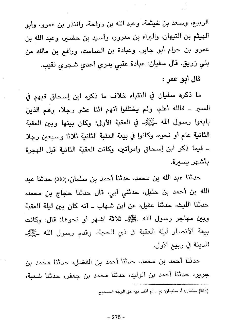 قَالَ أَبُو عُمَرَ ما ذكره سفيان في النقباء خلاف م ذَكَرَهُ ابْنُ إِسْحَاقَ فِيهِمْ فِي السِّيَرِ فَاللَّهُ أَعْلَمُ وَلَمْ يَخْتَلِفُوا أَنَّهُمُ اثْنَا عَشَرَ رَجُلًا وهم الذين بايعوا رسول الله فِي الْعَقَبَةِ الْأُولَى وَكَانَ بَيْنَهَا وَبَيْنَ الْعَقَبَةِ الثَّانِيَةِ عَامٌ أَوْ نَحْوُهُ وَكَانُوا فِي بَيْعَةِ الْعَقَبَةِ الثَّانِيَةِ ثَلَاثًا وَسَبْعِينَ رَجُلًا فِيمَا ذَكَرَ ابْنُ إِسْحَاقَ وَامْرَأَتَيْنِ وَكَانَتِ الْعَقَبَةُ الثَّانِيَةُ قَبْلَ الْهِجْرَةِ بِأَشْهُرٍ يَسِيرَةٍ