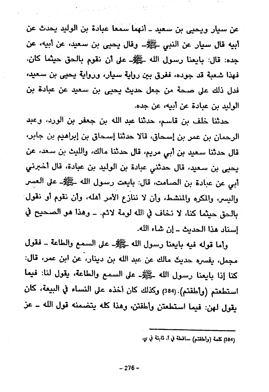 حَدَّثَنَا خَلَفُ بْنُ قَاسِمٍ حَدَّثَنَا عَبْدُ اللَّهِ بْنُ جَعْفَرِ بْنِ الْوَرْدِ وَعَبْدُ الرَّحْمَنِ بْنُ عُمَرَ بْنِ إِسْحَاقَ قَالَا حَدَّثَنَا إِسْحَاقُ بْنُ إِبْرَاهِيمَ بْنِ جَابِرٍ قَالَ حَدَّثَنَا سَعِيدُ بْنُ أَبِي مَرْيَمَ قَالَ حَدَّثَنَا مَالِكٍ وَاللَّيْثِ بْنِ سَعْدٍ عَنْ يَحْيَى بْنِ سَعِيدٍ قَالَ حَدَّثَنِي عُبَادَةُ بْنُ الْوَلِيدِ بْنِ عُبَادَةَ قَالَ أَخْبَرَنِي أَبِي عَنْ عُبَادَةَ بْنِ الصَّامِتِ قَالَ بَايَعْتُ رسول الله عَلَى الْعُسْرِ وَالْيُسْرِ وَالْمَكْرَهِ وَالْمَنْشَطِ وَأَنْ لَا نُنَازِعَ الْأَمْرَ أَهْلَهُ وَأَنْ نَقُومَ أَوْ نَقُولَ بِالْحَقِّ حَيْثُمَا كُنَّا لَا نَخَافُ فِي اللَّهِ لَوْمَةَ لَائِمٍ وَهَذَا هُوَ الصَّحِيحُ فِي إِسْنَادِ هَذَا الْحَدِيثِ إِنْ شَاءَ اللَّهُ