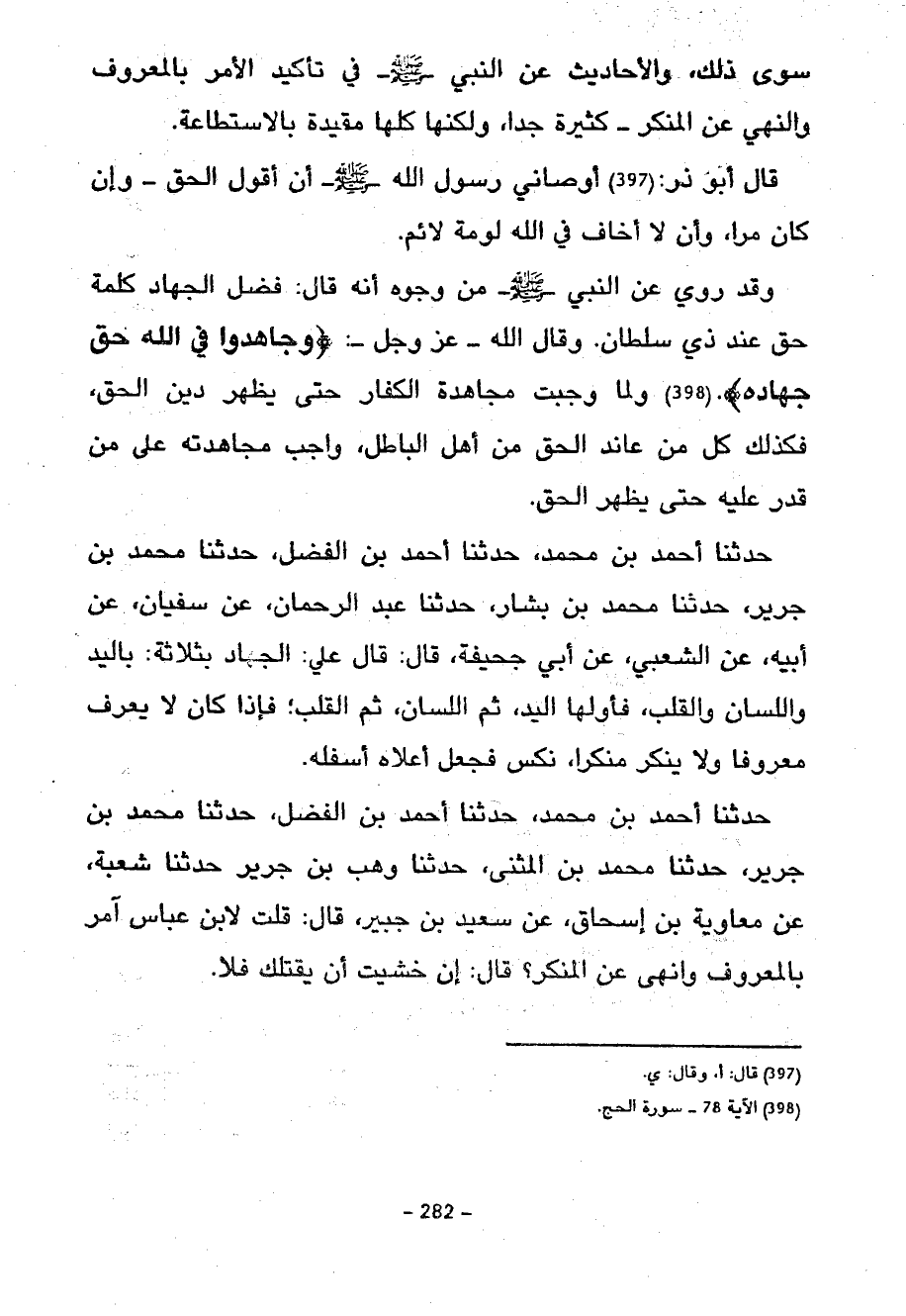 سِوَى ذَلِكَ وَالْأَحَادِيثُ عَنِ النَّبِيِّ صَلَّى اللَّهُ عَلَيْهِ وَسَلَّمَ فِي تَأْكِيدِ الْأَمْرِ بِالْمَعْرُوفِ وَالنَّهْيِ عَنِ الْمُنْكَرِ كَثِيرَةٌ جِدًّا وَلَكِنَّهَا كُلَّهَا مُقَيَّدَةٌ بِالِاسْتِطَاعَةِ