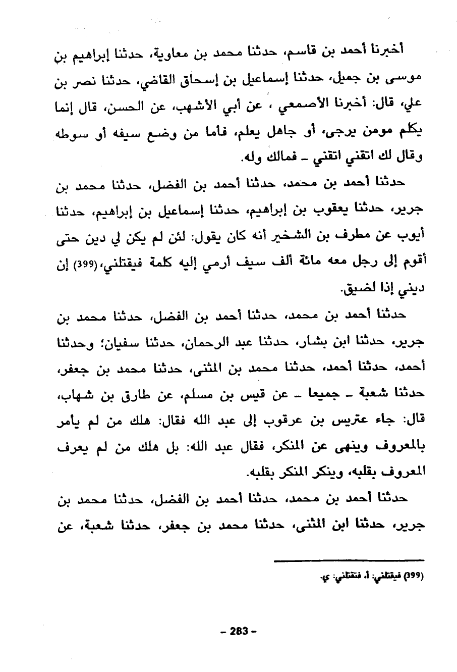 حَدَّثَنَا أَحْمَدُ بْنُ مُحَمَّدٍ حَدَّثَنَا أَحْمَدُ بْنُ الْفَضْلِ حَدَّثَنَا مُحَمَّدُ بْنُ جَرِيرٍ حَدَّثَنَا ابْنُ بَشَّارٍ حَدَّثَنَا عَبْدُ الرَّحْمَنِ حَدَّثَنَا سُفْيَانُ وَحَدَّثَنَا أَحْمَدُ حَدَّثَنَا أَحْمَدُ حَدَّثَنَا مُحَمَّدُ بْنُ الْمُثَنَّى حَدَّثَنَا مُحَمَّدُ بْنُ جَعْفَرٍ حَدَّثَنَا شُعْبَةُ جَمِيعًا عَنْ قَيْسِ بْنِ مُسْلِمٍ عَنْ طَارِقِ بْنِ شِهَابٍ قَالَ جَاءَ عَتْرِيسُ بْنُ عُرْقُوبٍ إِلَى عَبْدِ اللَّهِ فَقَالَ هَلَكَ مَنْ لَمْ يَأْمُرْ بِالْمَعْرُوفِ وَيَنْهَى عَنِ الْمُنْكَرِ فَقَالَ عَبْدُ اللَّهِ بَلْ هَلَكَ مَنْ لَمْ يَعْرِفِ الْمَعْرُوفَ بِقَلْبِهِ وَيُنْكِرِ الْمُنْكَرَ بِقَلْبِهِ