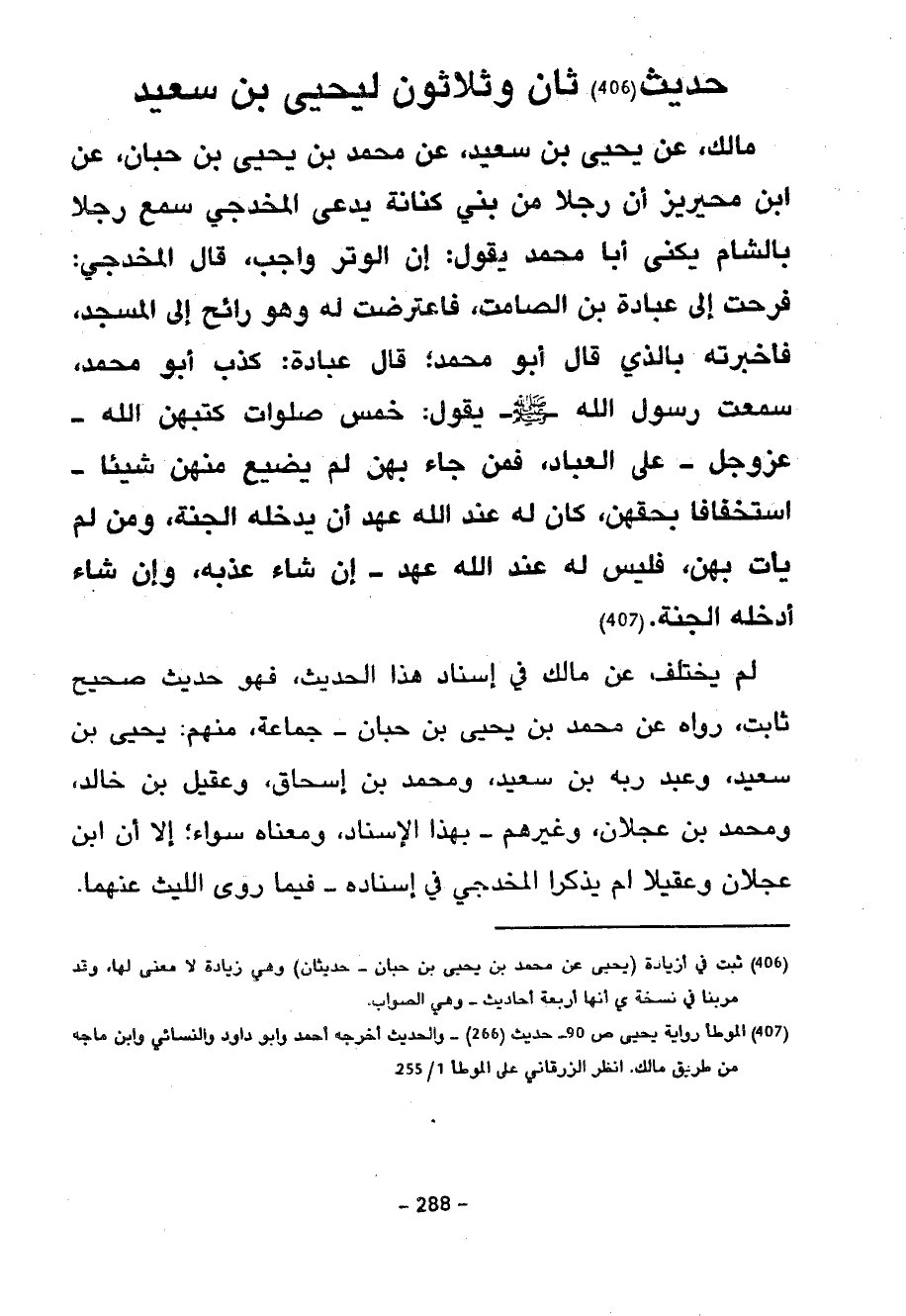 537 - مَالِكٌ عَنْ يَحْيَى بْنِ سَعِيدٍ عَنْ مُحَمَّدِ بْنُ يَحْيَى بْنِ حَبَّانَ عَنِ ابْنِ مُحَيْرِيزٍ أَنَّ رَجُلًا مِنْ بَنِي كِنَانَةَ يُدْعَى الْمُخْدَجِيَّ سَمِعَ رَجُلًا بِالشَّامِ يُكْنَى أَبَا مُحَمَّدٍ يَقُولُ إِنَّ الْوِتْرَ وَاجِبٌ قَالَ الْمُخْدَجِيُّ فَرُحْتُ إِلَى عُبَادَةَ بْنِ الصَّامِتِ فَاعْتَرَضْتُ لَهُ وَهُوَ رَائِحٌ إِلَى الْمَسْجِدِ فَأَخْبَرْتُهُ بِالَّذِي قَالَ أَبُو مُحَمَّدٍ قَالَ عُبَادَةُ كَذَبَ أَبُو مُحَمَّدٍ سَمِعْتُ رَسُولَ اللَّهِ صَلَّى اللَّهُ عَلَيْهِ وَسَلَّمَ يَقُولُ خَمْسُ صَلَوَاتٍ كَتَبَهُنَّ اللَّهُ عَزَّ وَجَلَّ عَلَى الْعِبَادِ فَمَنْ جَاءَ بِهِنَّ لَمْ يُضَيِّعْ مِنْهُنَّ شَيْئًا اسْتِخْفَافًا بِحَقِّهِنَّ كَانَ لَهُ عِنْدَ اللَّهِ عَهْدٌ أَنْ يُدْخِلَهُ الْجَنَّةَ وَمَنْ لَمْ يَأْتِ بِهِنَّ فَلَيْسَ لَهُ عِنْدَ اللَّهِ عَهْدٌ إِنْ شَاءَ عَذَّبَهُ وَإِنْ شَاءَ أَدْخَلَهُ الْجَنَّةَ