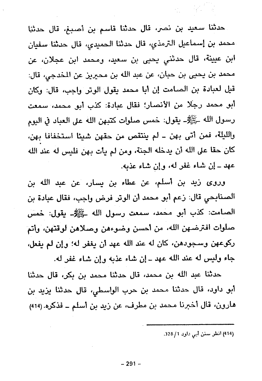حَدَّثَنَا سَعِيدُ بْنُ نَصْرٍ قَالَ حَدَّثَنَا قَاسِمُ بْنُ أَصْبَغَ قَالَ حَدَّثَنَا مُحَمَّدُ بْنُ إِسْمَاعِيلَ التِّرْمِذِيُّ قَالَ حَدَّثَنَا الْحُمَيْدِيُّ قَالَ حَدَّثَنَا سُفْيَانُ بْنُ عُيَيْنَةَ قَالَ حَدَّثَنِي يَحْيَى بْنُ سَعِيدٍ وَمُحَمَّدُ بْنِ عَجْلَانَ عَنْ مُحَمَّدِ بْنِ يَحْيَى بْنِ حَبَّانَ عَنْ عَبْدِ اللَّهِ بْنِ مُحَيْرِيزٍ عَنِ الْمُخْدَجِيِّ قَالَ قِيلَ لِعُبَادَةَ بْنِ الصَّامِتِ إِنَّ أَبَا مُحَمَّدٍ يَقُولُ الْوِتْرُ وَاجِبٌ قَالَ وَكَانَ أَبُو مُحَمَّدٍ رَجُلًا مِنَ الْأَنْصَارِ فَقَالَ عُبَادَةُ كَذَبَ أَبُو مُحَمَّدٍ سَمِعْتُ رَسُولَ اللَّهِ صَلَّى اللَّهُ عَلَيْهِ وَسَلَّمَ يَقُولُ خَمْسُ صَلَوَاتٍ كَتَبَهُنَّ اللَّهُ عَلَى الْعِبَادِ فِي الْيَوْمِ وَاللَّيْلَةِ فَمَنْ أَتَى بِهِنَّ لَمْ يَنْتَقِصْ مِنْ حَقِّهِنَّ شَيْئًا اسْتِخْفَافًا بِهِنَّ كَانَ حَقًّا عَلَى اللَّهِ أَنْ يُدْخِلَهُ الْجَنَّةَ وَمَنْ لَمْ يَأْتِ بِهِنَّ فَلَيْسَ لَهُ عِنْدَ اللَّهِ عَهْدٌ إِنْ شَاءَ غَفَرَ لَهُ وَإِنْ شَاءَ عَذَّبَهُ