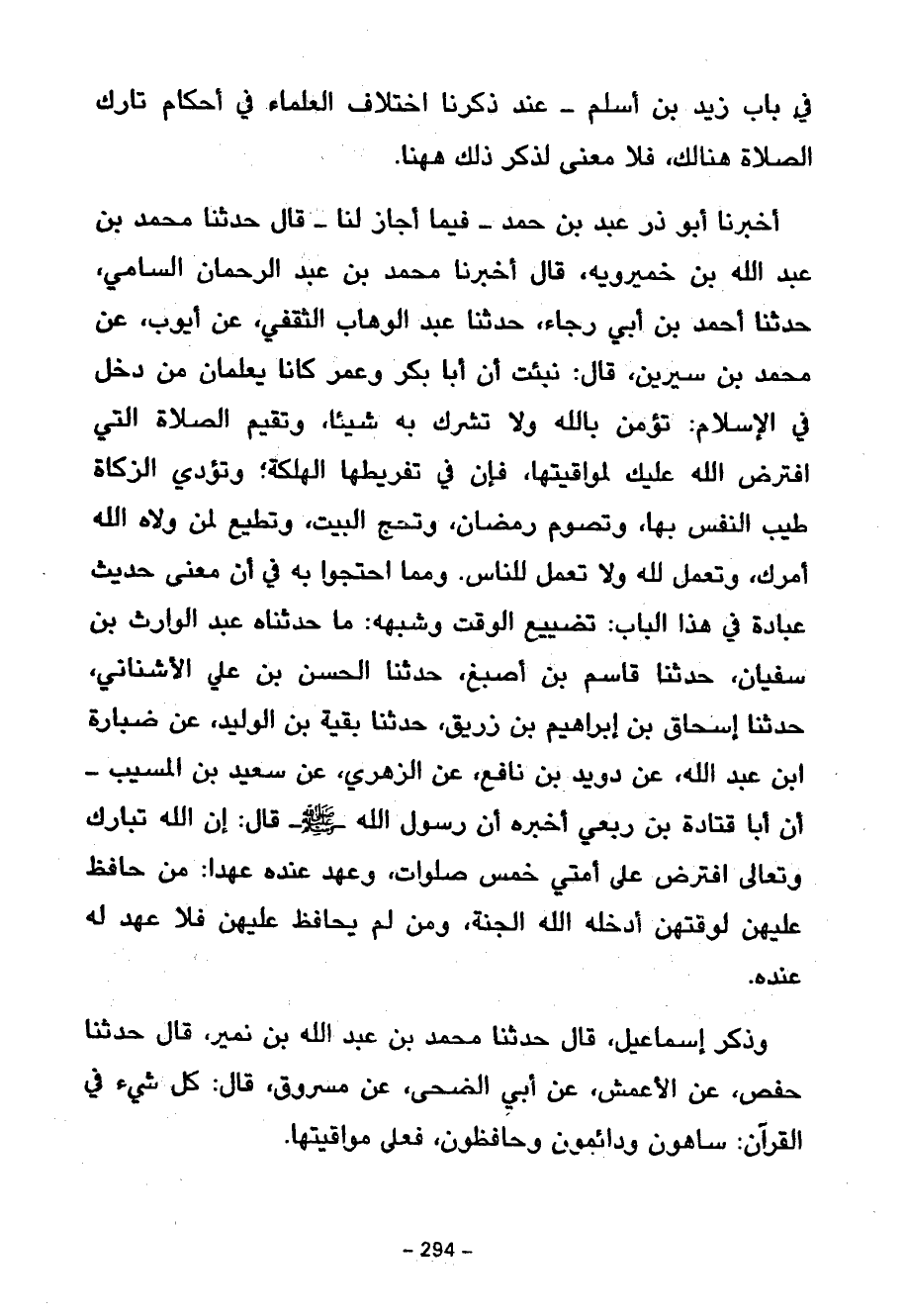 أَخْبَرَنَا أَبُو ذَرٍّ عَبْدُ بْنُ حَمَدٍ فِيمَا أَجَازَ لَنَا قَالَ حَدَّثَنَا مُحَمَّدُ بْنُ عَبْدِ اللَّهِ بْنِ خَمِيرَوَيْهِ قَالَ أَخْبَرَنَا مُحَمَّدُ بْنُ عَبْدِ الرَّحْمَنِ السَّامِيُّ حَدَّثَنَا أَحْمَدُ بْنُ أَبِي رَجَاءٍ حَدَّثَنَا عَبْدُ الْوَهَّابِ الثَّقَفِيِّ عَنْ أَيُّوبَ عَنْ مُحَمَّدِ بْنِ سِيرِينَ قَالَ نُبِّئْتُ أَنَّ أَبَا بَكْرٍ وَعُمَرَ كَانَا يُعَلِّمَانِ مَنْ دَخَلَ فِي الْإِسْلَامِ تُؤْمِنُ بِاللَّهِ وَلَا تُشْرِكُ بِهِ شَيْئًا وَتُقِيمُ الصَّلَاةَ الَّتِي افْتَرَضَ اللَّهُ عَلَيْكَ لِمَوَاقِيتِهَا فَإِنَّ فِي تَفْرِيطِهَا الْهَلَكَةَ وَتُؤَدِّي الزَّكَاةَ طَيِّبَ النَّفْسِ بِهَا وَتَصُومُ رَمَضَانَ وَتَحُجُّ الْبَيْتَ وَتُطِيعُ لِمَنْ وَلَّاهُ اللَّهُ أَمْرَكَ وَتَعْمَلُ لِلَّهِ وَلَا تَعْمَلُ لِلنَّاسِ