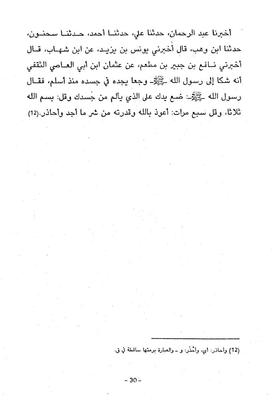 أَخْبَرَنَا عَبْدُ الرَّحْمَنِ حَدَّثَنَا عَلِيٌّ حَدَّثَنَا أَحْمَدُ حَدَّثَنَا سَحْنُونُ حَدَّثَنَا ابْنُ وَهْبٍ قَالَ أَخْبَرَنِي يُونُسُ بْنُ يَزِيدَ عَنِ ابْنِ شِهَابٍ قَالَ أَخْبَرَنِي نَافِعُ بْنُ جُبَيْرِ بْنِ مُطْعِمٍ عَنْ عثمان ابن أَبِي الْعَاصِ الثَّقَفِيِّ أَنَّهُ شَكَا إِلَى رَسُولِ اللَّهِ صَلَّى اللَّهُ عَلَيْهِ وَسَلَّمَ وَجَعًا يَجِدُهُ فِي جَسَدِهِ مُنْذُ أَسْلَمَ فَقَالَ رَسُولُ اللَّهِ صَلَّى اللَّهُ عَلَيْهِ وَسَلَّمَ ضَعْ يَدَكَ عَلَى الَّذِي يَأْلَمُ مِنْ جَسَدِكَ وَقُلْ بِسْمِ اللَّهِ ثَلَاثًا وَقُلْ سَبْعَ مَرَّاتٍ أَعُوْذُ بِاللَّهِ وَقُدْرَتِهِ مِنْ شَرِّ مَا أَجِدُ وَأُحَاذِرُ