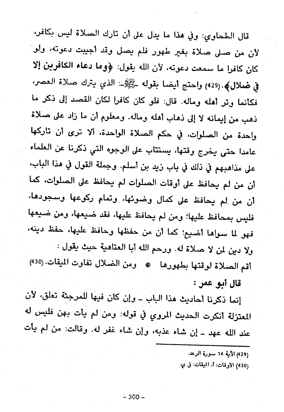 وَرَحِمَ اللَّهُ أَبَا الْعَتَاهِيَةِ حَيْثُ يَقُولُ أَقِمِ الصَّلَاةَ لِوَقْتِهَا بِطَهُورِهَا وَمِنَ الضَّلَالِ تفاوت الميقات قال أبو عمر إنما ذكرت أَحَادِيثَ هَذَا الْبَابِ وَإِنْ كَانَ فِيهَا لِلْمُرْجِئَةِ تَعَلُّقٌ لِأَنَّ الْمُعْتَزِلَةَ أَنْكَرَتِ الْحَدِيثَ الْمَرْوِيَّ فِي قَوْلِهِ وَمَنْ لَمْ يَأْتِ بِهِنَّ فَلَيْسَ لَهُ عِنْدَ اللَّهِ عَهْدٌ إِنْ شَاءَ عَذَّبَهُ وَإِنْ شَاءَ غَفَرَ لَهُ