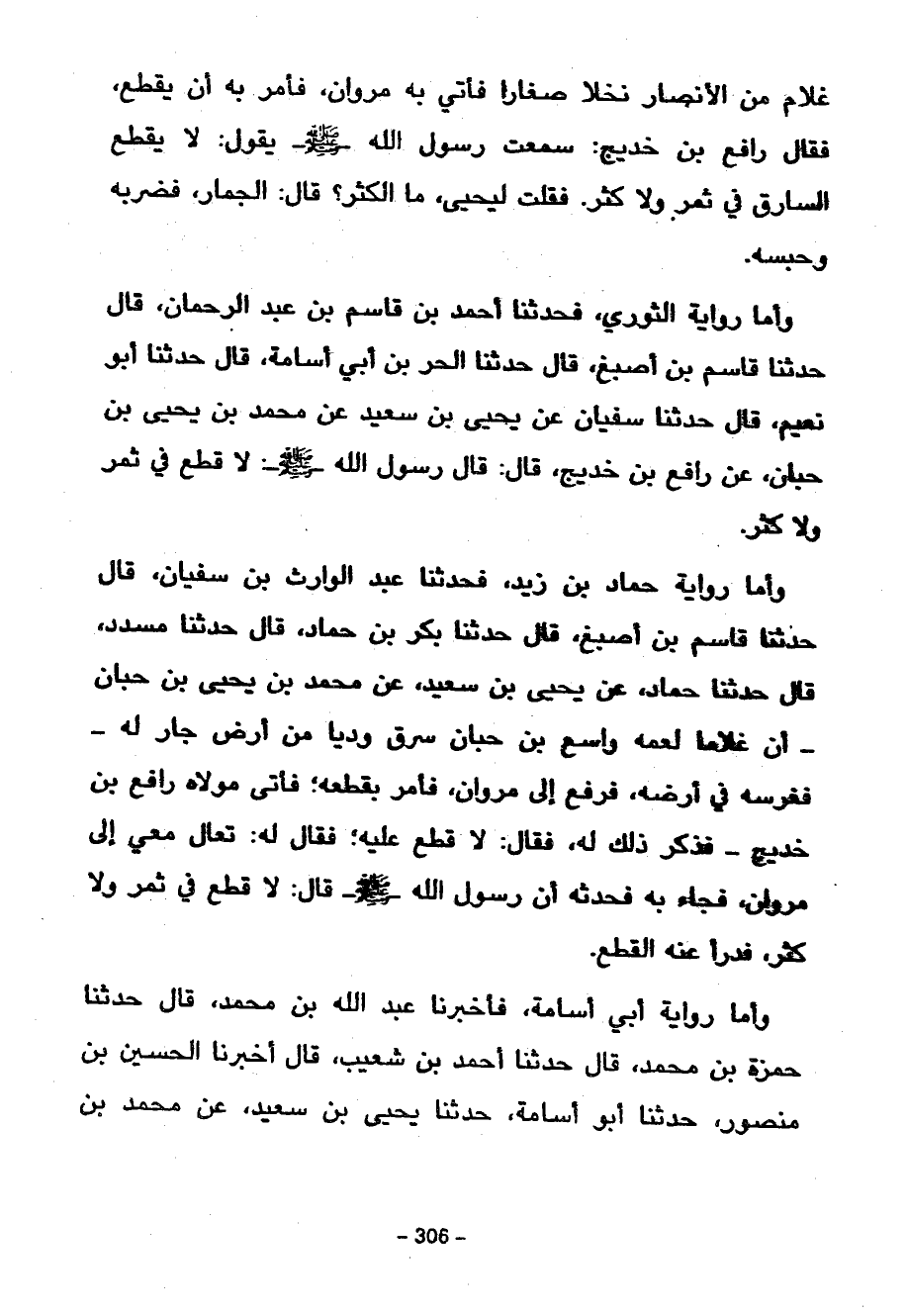 وَأَمَّا رِوَايَةُ حَمَّادِ بْنِ زَيْدٍ فَحَدَّثَنَا عَبْدُ الْوَارِثِ بْنُ سُفْيَانَ قَالَ حَدَّثَنَا قَاسِمُ بْنُ أَصْبَغَ قَالَ حَدَّثَنَا بَكْرُ بْنُ حَمَّادٍ قَالَ حَدَّثَنَا مُسَدَّدٌ قَالَ حَدَّثَنَا حَمَّادُ عَنْ يَحْيَى بْنِ سَعِيدٍ عَنْ مُحَمَّدِ بْنِ يحيى بن حبان أن غلاما لعمه واسع بن حبان سَرَقَ وِدِيًّا مِنْ أَرْضِ جَارٍ لَهُ فَغَرَسَهُ في أرضه فرفع إلى مرون فَأَمَرَ بِقَطْعِهِ فَأَتَى مَوْلَاهُ رَافِعَ بْنَ خَدِيجٍ فَذَكَرَ ذَلِكَ لَهُ فَقَالَ لَا قَطْعَ عَلَيْهِ فقال له تعال معي إلى مرون فجاء به فحدثه أن رسول الله قَالَ لَا قَطْعَ فِي ثَمَرٍ وَلَا كَثَرٍ فَدَرَأَ عَنْهُ الْقَطْعَ