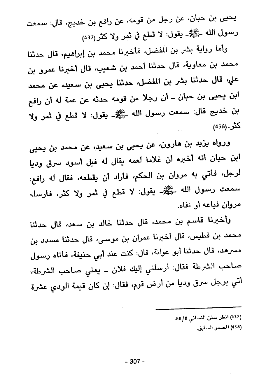 وَأَمَّا رِوَايَةُ بِشْرِ بْنِ الْمُفَضَّلِ فَأَخْبَرَنَا مُحَمَّدُ بْنُ إِبْرَاهِيمَ قَالَ حَدَّثَنَا مُحَمَّدُ بْنُ مُعَاوِيَةَ قَالَ حَدَّثَنَا أَحْمَدُ بْنُ شُعَيْبٍ قَالَ أَخْبَرَنَا عَمْرُو بْنُ عَلِيٍّ قَالَ حَدَّثَنَا بِشْرُ بْنُ الْمُفَضَّلِ حَدَّثَنَا يَحْيَى بْنُ سَعِيدٍ عَنْ مُحَمَّدِ بْنِ يَحْيَى بْنِ حَبَّانَ أَنَّ رَجُلًا مِنْ قَوْمِهِ حَدَّثَهُ عَنْ عَمَّةٍ لَهُ أَنَّ رَافِعَ بن خديج قال سمعت رسول الله يَقُولُ لَا قَطْعَ فِي ثَمَرٍ وَلَا كَثَرٍ