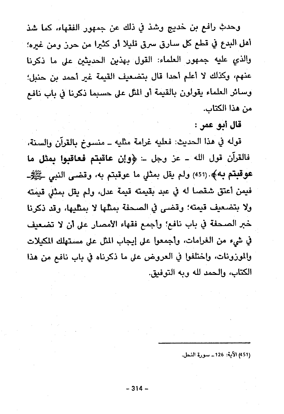 وَلَمْ يَقُلْ بمثلي ما عوقبتم له وقضى النبي فِيمَنْ أَعْتَقَ شِقْصًا لَهُ فِي عَبْدٍ بِقِيمَتِهِ قِيمَةَ عَدْلٍ وَلَمْ يَقُلْ بِمِثْلَيْ قِيمَتِهِ وَلَا بتضعيف قيمته وقضى في الصحفة بمثليها لا بمثيلها وَقَدْ ذَكَرْنَا خَبَرَ الصَّحْفَةِ فِي بَابِ نَافِعٍ وَأَجْمَعَ فُقَهَاءُ الْأَمْصَارِ عَلَى أَنْ لَا تَضْعِيفَ فِي شَيْءٍ مِنَ الْغَرَامَاتِ وَأَجْمَعُوا عَلَى إِيجَابِ الْمِثْلِ عَلَى مُسْتَهْلِكِ الْمَكِيلَاتِ وَالْمَوْزُونَاتِ وَاخْتَلَفُوا فِي الْعُرُوضِ عَلَى مَا ذَكَرْنَاهُ فِي بَابِ نَافِعٍ مِنْ هَذَا الْكِتَابِ وَالْحَمْدُ لِلَّهِ وَبِهِ التَّوْفِيقُ