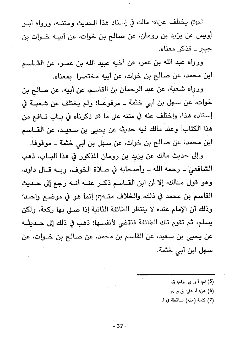 وَإِلَى حَدِيثِ مَالِكٍ عَنْ يَزِيدَ بْنِ رُومَانَ الْمَذْكُورِ فِي هَذَا الْبَابِ ذَهَبَ الشَّافِعِيُّ رَحِمَهُ اللَّهُ وَأَصْحَابُهُ فِي صَلَاةِ الْخَوْفِ وَبِهِ قَالَ دَاوُدُ وَهُوَ قَوْلُ مَالِكٍ إِلَّا أَنَّ ابْنَ الْقَاسِمِ ذَكَرَ عَنْهُ أَنَّهُ رَجَعَ إِلَى حَدِيثِ الْقَاسِمِ بْنِ مُحَمَّدٍ فِي ذَلِكَ وَالْخِلَافُ مِنْهُ إِنَّمَا هُوَ فِي مَوْضِعٍ وَاحِدٍ وَذَلِكَ أَنَّ الْإِمَامَ عِنْدَهُ لَا يَنْتَظِرُ الطَّائِفَةَ الثَّانِيَةَ إِذَا صَلَّى بِهَا رَكْعَةً وَلَكِنْ يُسَلِّمُ ثُمَّ تَقُومُ تِلْكَ الطَّائِفَةُ فَتَقْضِي لِأَنْفُسِهَا ذَهَبَ فِي ذَلِكَ إِلَى حَدِيثِهِ عَنْ يَحْيَى بْنِ سَعِيدٍ عَنِ الْقَاسِمِ بْنِ مُحَمَّدٍ عَنْ صَالِحِ بْنِ خوات عن سهل ابن أبي خثمة