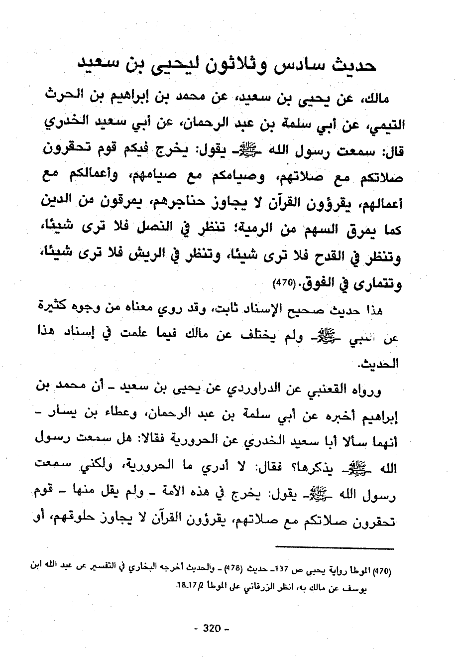 وَرَوَاهُ الْقَعْنَبِيُّ عَنِ الدَّرَاوَرْدِيِّ عَنْ يَحْيَى بْنِ سَعِيدٍ أَنَّ مُحَمَّدَ بْنَ إِبْرَاهِيمَ أَخْبَرَهُ عَنْ أَبِي سَلَمَةَ بْنِ عَبْدِ الرَّحْمَنِ وَعَطَاءِ بْنِ يَسَارٍ أَنَّهُمَا سَأَلَا أَبَا سَعِيدٍ الْخُدْرِيَّ عَنِ الْحَرُورِيَّةِ فَقَالَا هَلْ سَمِعْتَ رسول الله يَذْكُرُهَا فَقَالَ لَا أَدْرِي مَا الْحَرُورِيَّةُ وَلَكِنِّي سمعت رسول الله يَقُولُ يَخْرُجُ فِي هَذِهِ الْأُمَّةِ وَلَمْ يَقُلْ منها قوم تحقورن صلاتكم مع صلاتهم يقرؤون الْقُرْآنَ لَا يُجَاوِزُ حُلُوقَهُمْ أَوْ