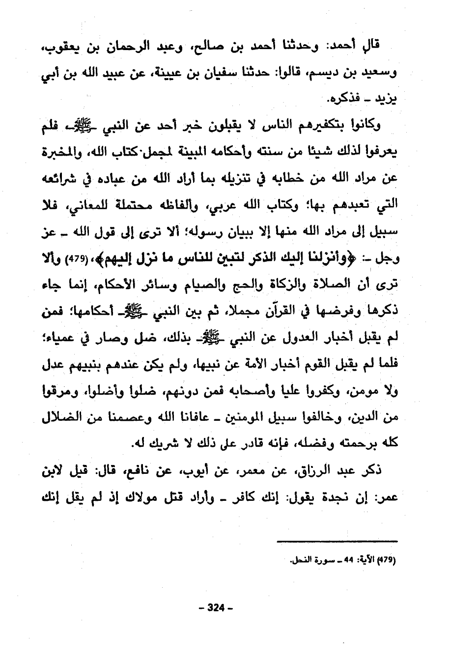 وَكَانُوا بِتَكْفِيرِهِمُ النَّاسَ لا يقبلون خبر أحد عن النبي فَلَمْ يَعْرِفُوا لِذَلِكَ شَيْئًا مِنْ سُنَّتِهِ وَأَحْكَامِهِ الْمُبَيِّنَةِ لِمُجْمَلِ كِتَابِ اللَّهِ وَالْمُخْبِرَةِ عَنْ مُرَادِ اللَّهِ مِنْ خِطَابِهِ فِي تَنْزِيلِهِ بِمَا أَرَادَ اللَّهُ مِنْ عِبَادِهِ فِي شَرَائِعِهِ الَّتِي تَعَبَّدَهُمْ بِهَا وَكِتَابُ اللَّهِ عَرَبِيٌّ وَأَلْفَاظُهُ مُحْتَمِلَةٌ لِلْمَعَانِي فَلَا سَبِيلَ إِلَى مُرَادِ اللَّهِ مِنْهَا إِلَّا بِبَيَانِ رَسُولِهِ أَلَا تَرَى إِلَى قَوْلِ اللَّهُ عَزَّ وَجَلَّ وَأَنْزَلْنَا إِلَيْكَ الذِّكْرَ لِتُبَيِّنَ لِلنَّاسِ مَا نُزِّلَ إِلَيْهِمْ (16 44) وَأَلَا تَرَى أَنَّ الصَّلَاةَ وَالزَّكَاةَ وَالْحَجَّ وَالصِّيَامَ وَسَائِرَ الْأَحْكَامِ إِنَّمَا جَاءَ ذِكْرُهَا وَفَرْضُهَا فِي الْقُرْآنِ مُجْمَلًا ثُمَّ بَيَّنَ النبي أَحْكَامَهَا فَمَنْ لَمْ يَقْبَلْ أَخْبَارَ الْعُدُولِ عَنِ النبي بِذَلِكَ ضَلَّ وَصَارَ فِي عَمْيَاءَ فَلَمَّا لَمْ يَقْبَلِ الْقَوْمُ أَخْبَارَ الْأُمَّةِ عَنْ نَبِيِّهَا وَلَمْ يكن عندهم بنبيهم عدل ولا مؤمن وَكَفَّرُوا عَلِيًّا وَأَصْحَابَهُ فَمَنْ دُونَهُمْ ضَلُّوا وَأَضَلُّوا وَمَرَقُوا مِنَ الدِّينِ وَخَالَفُوا سَبِيلَ الْمُؤْمِنِينَ عَافَانَا اللَّهُ وَعَصَمَنَا مِنَ الضَّلَالِ كُلِّهِ بِرَحْمَتِهِ وَفَضْلِهِ فَإِنَّهُ قَادِرٌ عَلَى ذَلِكَ لَا شَرِيكَ لَهُ
