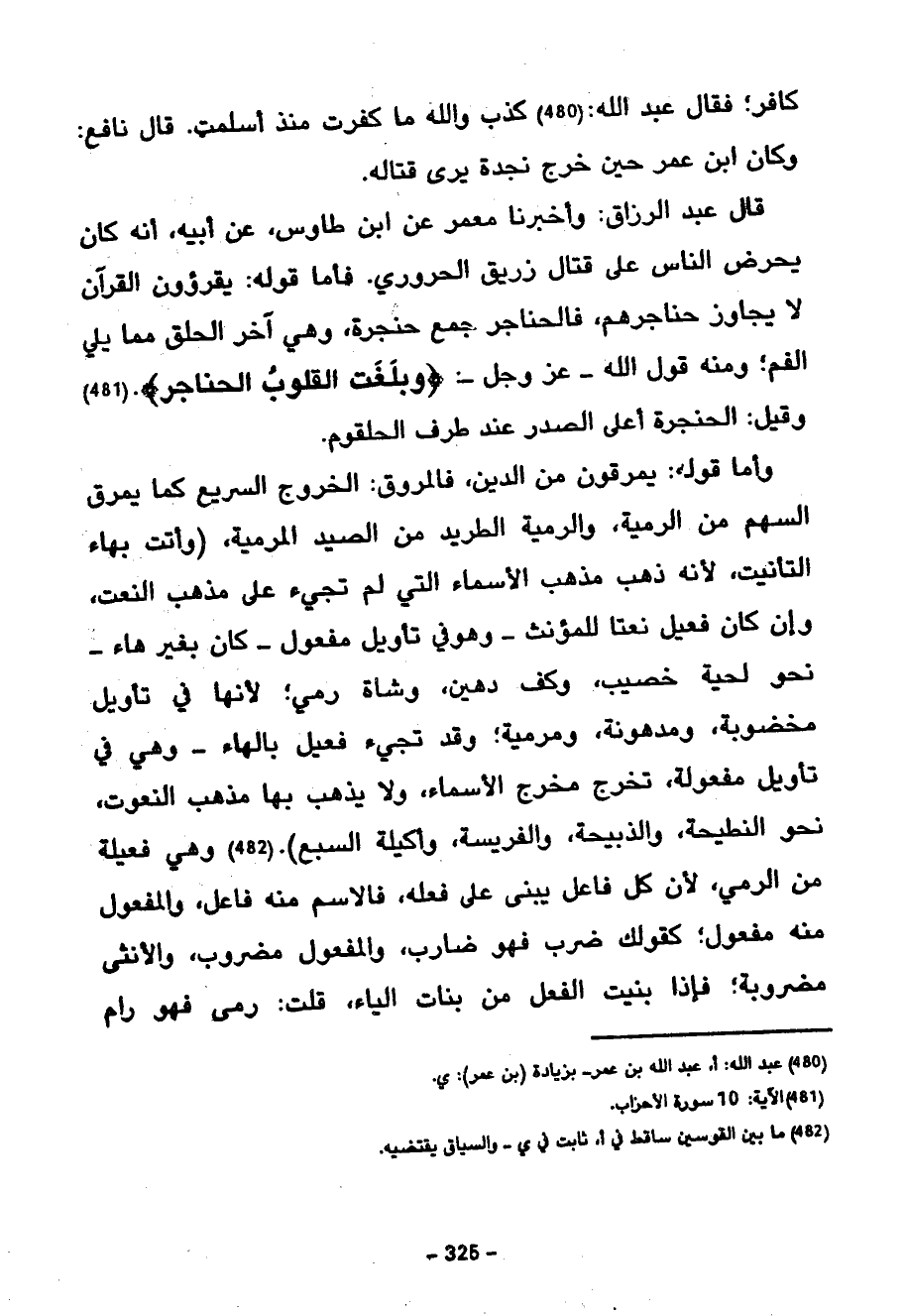 فأما قوله يقرؤون الْقُرْآنَ لَا يُجَاوِزُ حَنَاجِرَهُمْ فَالْحَنَاجِرُ جَمْعُ حَنْجَرَةٍ وَهِيَ آخِرُ الْحَلْقِ مِمَّا يَلِي الْفَمَ وَمِنْهُ قَوْلُ اللَّهِ عَزَّ وَجَلَّ وَبَلَغَتِ الْقُلُوبُ الْحَنَاجِرَ (33 10) وَقِيلَ الْحَنْجَرَةُ أَعْلَى الصَّدْرِ عِنْدَ طَرَفِ الْحُلْقُومِ