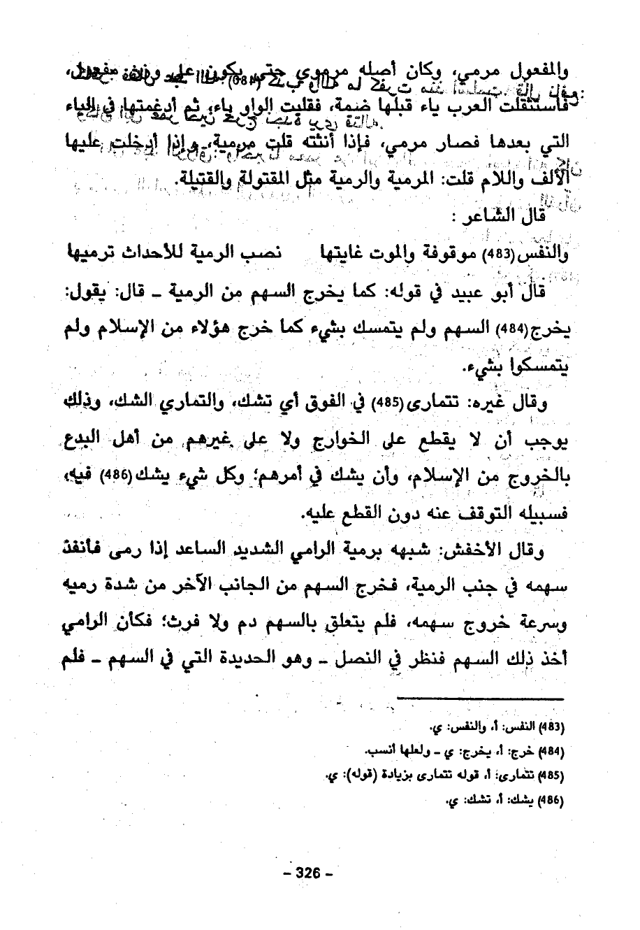 قَالَ الشَّاعِرُ وَالنَّفْسُ مَوْقُوفَةٌ وَالْمَوْتُ غَايَتُهَا نَصْبَ الرَّمِيَّةِ لِلْأَحْدَاثِ تَرْمِيهَا قَالَ أَبُو عُبَيْدٍ فِي قَوْلِهِ كَمَا يَخْرُجُ السَّهْمُ مِنَ الرَّمِيَّةِ قَالَ يَقُولُ يَخْرُجُ السَّهْمُ وَلَمْ يَتَمَسَّكْ بِشَيْءٍ كَمَا خَرَجَ هَؤُلَاءِ مِنِ الْإِسْلَامِ وَلَمْ يَتَمَسَّكُوا بِشَيْءٍ