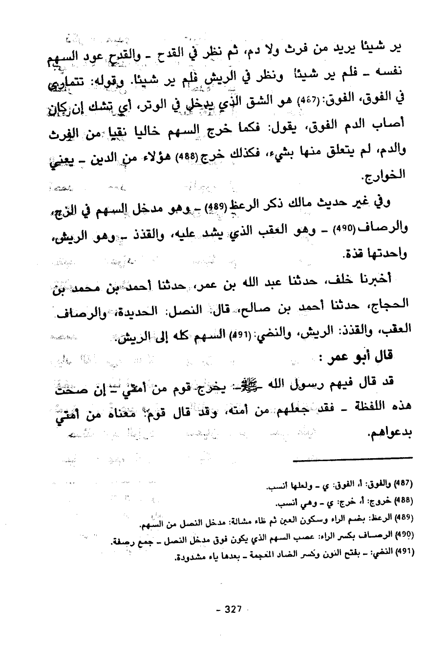 أَخْبَرَنَا خَلَفٌ حَدَّثَنَا عَبْدِ اللَّهِ بْنِ عُمَرَ حَدَّثَنَا أَحْمَدُ بْنُ مُحَمَّدِ بْنِ الْحَجَّاجِ حَدَّثَنَا أَحْمَدُ بْنُ صَالِحٍ قَالَ النَّصْلُ الْحَدِيدَةُ وَالرِّصَافُ الْعَقِبُ وَالْقُذَذُ الرِّيشُ وَالنَّضِيُّ السَّهْمُ كُلُّهُ إِلَى الرِّيشِ