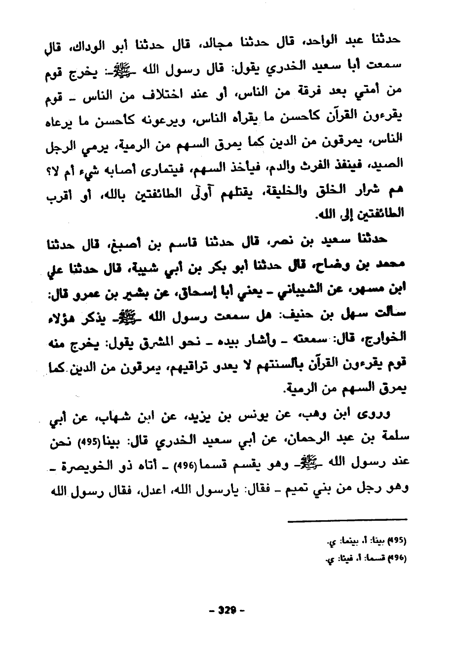 حَدَّثَنَا عَبْدُ الْوَاحِدِ قَالَ حَدَّثَنَا مُجَالِدٌ قَالَ حَدَّثَنَا أَبُو الْوَدَّاكِ قَالَ سَمِعْتُ أَبَا سَعِيدٍ الْخُدْرِيَّ يَقُولُ قَالَ رَسُولُ اللَّهِ يَخْرُجُ قَوْمٌ مِنْ أُمَّتِي بَعْدَ فُرْقَةٍ مِنَ النَّاسِ أَوْ عِنْدَ اخْتِلَافٍ مِنَ النَّاسِ قَوْمٌ يقرؤون الْقُرْآنَ كَأَحْسَنِ مَا يَقْرَأُهُ النَّاسُ وَيَرْعَوْنَهُ كَأَحْسَنِ مَا يَرْعَاهُ النَّاسُ يَمْرُقُونَ مِنَ الدِّينِ كَمَا يَمْرُقُ السَّهْمُ مِنَ الرَّمِيَّةِ يَرْمِي الرَّجُلُ الصَّيْدَ فَيَنْفُذُ الْفَرْثَ وَالدَّمَ فَيَأْخُذُ السَّهْمَ فَيَتَمَارَى أَصَابَهُ شَيْءٌ أَمْ لَا هُمْ شِرَارُ الْخَلْقِ وَالْخَلِيقَةِ يَقْتُلُهُمْ أَوْلَى الطَّائِفَتَيْنِ بِاللَّهِ أَوْ أَقْرَبُ الطَّائِفَتَيْنِ إِلَى اللَّهِ