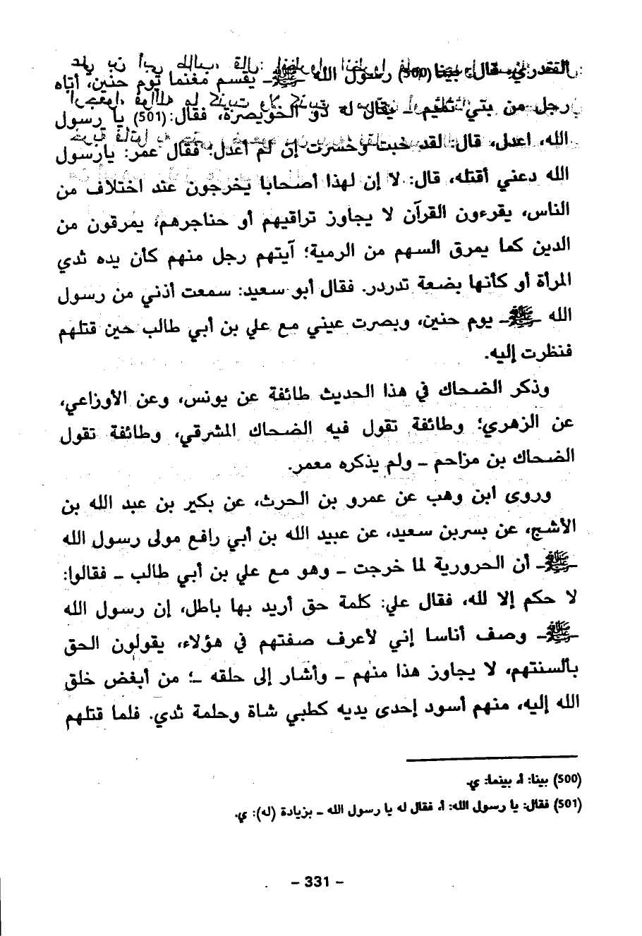 الْخُدْرِيِّ قَالَ بَيْنَا رَسُولُ اللَّهِ صَلَّى اللَّهُ عَلَيْهِ وَسَلَّمَ يَقْسِمُ مَغْنَمًا يَوْمَ حُنَيْنٍ أَتَاهُ رَجُلٌ مِنْ بَنِي تَمِيمٍ يُقَالُ لَهُ ذُو الْخُوَيْصَرَةِ فَقَالَ يَا رَسُولَ اللَّهِ اعْدِلْ قَالَ لَقَدْ خِبْتَ وَخَسِرْتَ إِنْ لَمْ أَعْدِلْ فَقَالَ عُمَرُ يَا رَسُولَ اللَّهِ دَعْنِي أَقْتُلْهُ قَالَ لَا إِنَّ لِهَذَا أَصْحَابًا يَخْرُجُونَ عِنْدَ اخْتِلَافٍ من الناس يقرؤون الْقُرْآنَ لَا يُجَاوِزُ تَرَاقِيَهُمْ أَوْ حَنَاجِرَهُمْ يَمْرُقُونَ مِنَ الدِّينِ كَمَا يَمْرُقُ السَّهْمُ مِنَ الرَّمِيَّةِ آيَتُهُمْ رَجُلٌ مِنْهُمْ كَأَنَّ يَدَهُ ثَدْيُ الْمَرْأَةِ أَوْ كَأَنَّهَا بَضْعَةٌ تَدَرْدَرُ