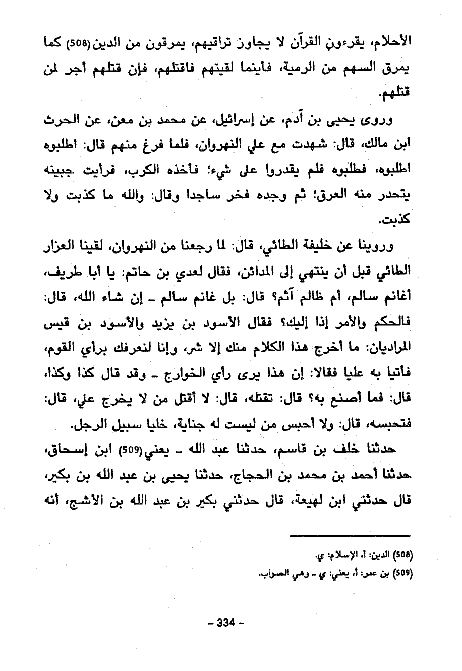 وَرُوِّينَا عَنْ خَلِيفَةَ الطَّائِيِّ قَالَ لَمَّا رَجَعْنَا مِنَ النَّهْرَوَانِ لقينا العزار الطائي قيل أَنْ يَنْتَهِيَ إِلَى الْمَدَائِنِ فَقَالَ لِعَدِيِّ بْنِ حَاتِمٍ يَا أَبَا طَرِيفٍ أَغَانِمٌ سَالِمٌ أَمْ ظَالِمٌ آثِمٌ قَالَ بَلْ غَانِمٌ سَالِمٌ إِنْ شَاءَ اللَّهُ قَالَ فَالْحُكْمُ وَالْأَمْرُ إِذًا إِلَيْكَ فَقَالَ الْأَسْوَدُ بْنُ يَزِيدَ وَالْأَسْوَدُ بْنُ قَيْسٍ الْمُرَادِيَّانِ مَا أَخْرَجَ هَذَا الْكَلَامَ مِنْكَ إِلَّا شَرٌّ وَإِنَّا لَنَعْرِفُكَ بِرَأْيِ الْقَوْمِ فَأَتَيَا بِهِ عَلِيًّا فَقَالَا إِنَّ هَذَا يَرَى رَأْيَ الْخَوَارِجِ وَقَدْ قَالَ كَذَا وَكَذَا قَالَ فَمَا أَصْنَعُ بِهِ قَالَ تَقْتُلُهُ قَالَ لَا أَقْتُلُ مَنْ لَا يَخْرُجُ عَلَيَّ قَالَ فَتَحْبِسُهُ قَالَ وَلَا أحبسن مَنْ لَيْسَتْ لَهُ جِنَايَةٌ خَلِّيَا سَبِيلَ الرَّجُلِ