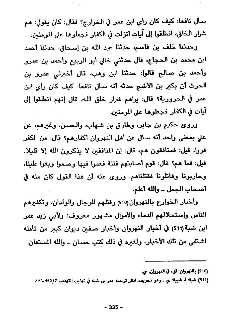 وَأَخْبَارُ الْخَوَارِجِ بِالنَّهْرَوَانِ وَقَتْلُهُمْ لِلرِّجَالِ وَالْوِلْدَانِ وَتَكْفِيرُهُمُ النَّاسَ وَاسْتِحْلَالُهُمُ الدِّمَاءَ وَالْأَمْوَالَ مَشْهُورٌ مَعْرُوفٌ وَلِأَبِي زيد عمر ابن شَبَّةَ فِي أَخْبَارِ النَّهْرَوَانِ وَأَخْبَارِ صِفِّينَ دِيوَانٌ كَبِيرٌ مَنْ تَأَمَّلَهُ اشْتَفَى مِنْ تِلْكَ الْأَخْبَارِ وَلِغَيْرِهِ فِي ذَلِكَ كُتُبٌ حِسَانٌ وَاللَّهُ الْمُسْتَعَانُ
