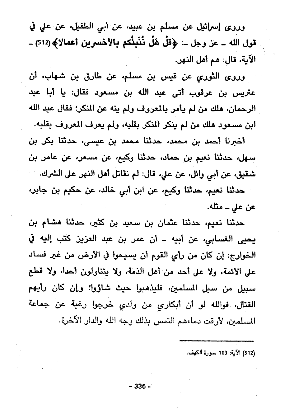 وَرَوَى إِسْرَائِيلُ عَنْ مُسْلِمِ بْنِ عُبَيْدٍ عَنْ أَبِي الطُّفَيْلِ عَنْ عَلِيٍّ فِي قَوْلِ اللَّهِ عَزَّ وَجَلَّ (قُلْ هَلْ نُنَبِّئُكُمْ بِالْأَخْسَرِينَ أَعْمَالًا (18 103) الْآيَةَ قَالَ هُمْ أَهْلُ النَّهْرِ