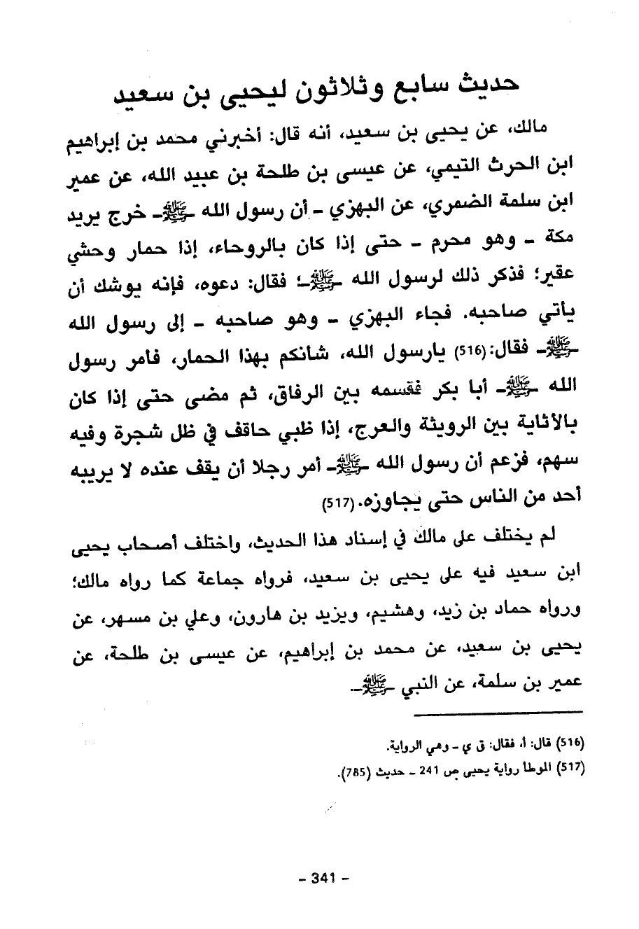 لَمْ يَخْتَلِفْ عَلَى مَالِكٍ فِي إِسْنَادِ هَذَا الْحَدِيثِ وَاخْتَلَفَ أَصْحَابُ يَحْيَى بْنِ سَعِيدٍ فِيهِ عَلَى يَحْيَى بْنِ سَعِيدٍ فَرَوَاهُ جَمَاعَةٌ كَمَا رَوَاهُ مَالِكٌ وَرَوَاهُ حَمَّادُ بْنُ زَيْدٍ وَهُشَيْمٌ وَيَزِيدُ بْنُ هَارُونَ وَعَلِيُّ بْنُ مُسْهِرٍ عَنْ يَحْيَى بْنِ سَعِيدٍ عَنْ مُحَمَّدِ بْنِ إِبْرَاهِيمَ عَنْ عِيسَى بْنِ طَلْحَةَ عَنْ عُمَيْرٍ بْنِ سَلَمَةَ عَنِ النَّبِيِّ صَلَّى اللَّهُ عَلَيْهِ وَسَلَّمَ