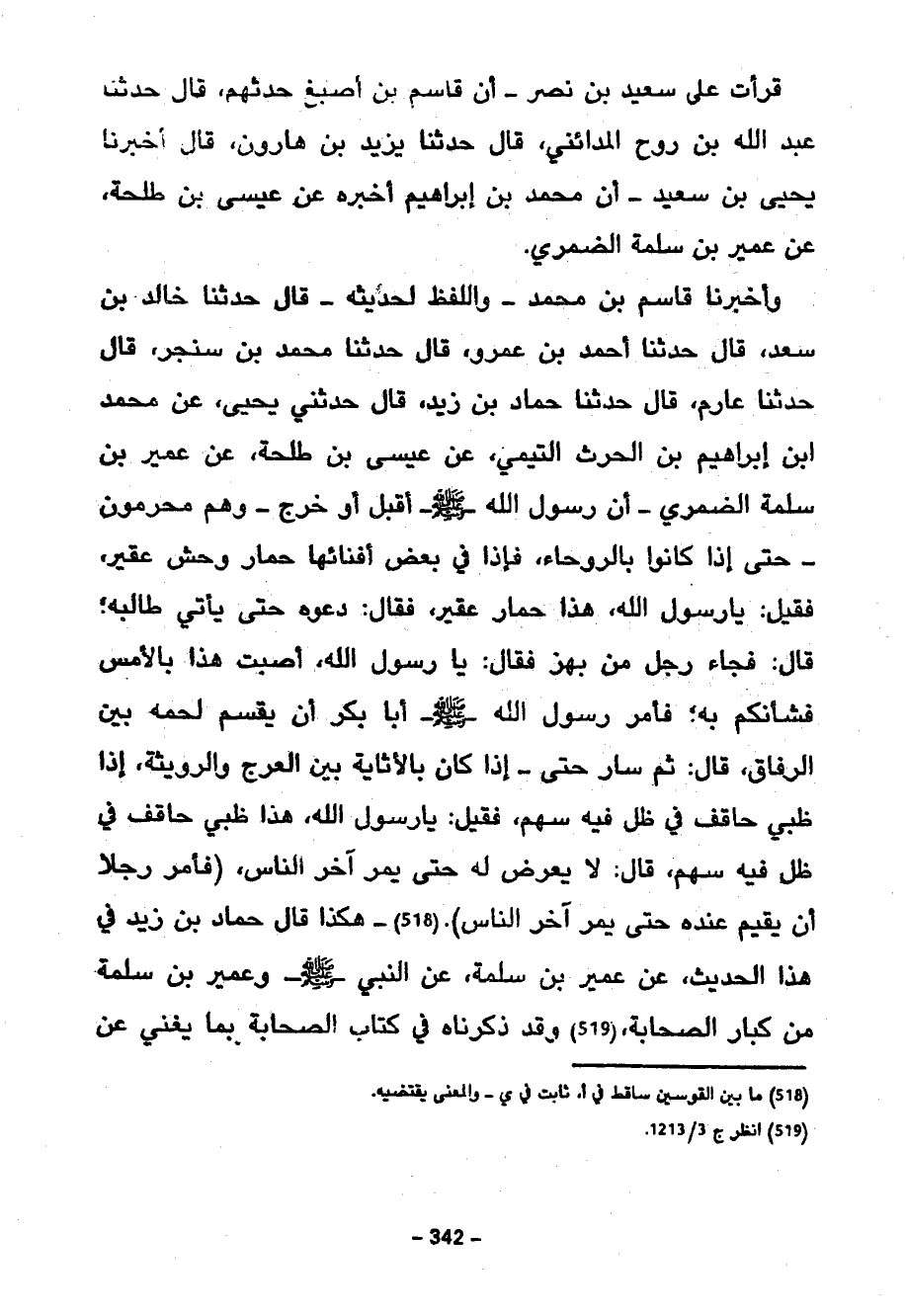 قَرَأْتُ عَلَى سَعِيدِ بْنِ نَصْرٍ أَنَّ قَاسِمَ بْنَ أَصْبَغَ حَدَّثَهُمْ قَالَ حَدَّثَنَا عَبْدُ اللَّهِ بْنُ رَوْحٍ الْمَدَائِنِيُّ قَالَ حَدَّثَنَا يَزِيدُ بْنُ هَارُونَ قَالَ أَخْبَرَنَا يَحْيَى بْنُ سَعِيدٍ أَنَّ محمدا بْنَ إِبْرَاهِيمَ أَخْبَرَهُ عَنْ عِيسَى بْنِ طَلْحَةَ عَنْ عُمَيْرِ بْنِ سَلَمَةَ الضَّمْرِيِّ