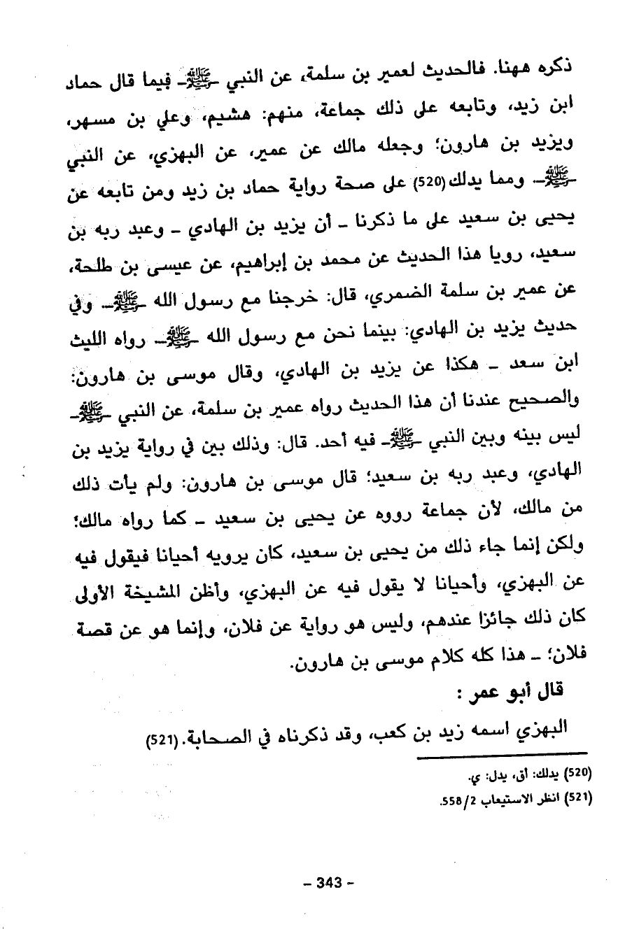 فَالْحَدِيثُ لِعُمَيْرِ بْنِ سَلَمَةَ عَنِ النَّبِيِّ صَلَّى اللَّهُ عَلَيْهِ وَسَلَّمَ فِيمَا قَالَ حَمَّادُ بْنُ زَيْدٍ وَتَابَعَهُ عَلَى ذَلِكَ جَمَاعَةٌ مِنْهُمْ هُشَيْمٌ وَعَلِيُّ بْنُ مُسْهِرٍ وَيَزِيدُ بْنُ هَارُونَ وَجَعَلَهُ مَالِكٌ عَنْ عُمَيْرٍ عَنِ الْبَهْزِيِّ عَنِ النَّبِيِّ صَلَّى اللَّهُ عَلَيْهِ وَسَلَّمَ وَمِمَّا يَدُلُّكَ عَلَى صِحَّةِ رِوَايَةِ حَمَّادِ بْنِ زَيْدٍ وَمَنْ تَابَعَهُ عَنْ يَحْيَى بْنِ سَعِيدٍ عَلَى مَا ذَكَرْنَا أَنَّ يَزِيدَ بْنَ الْهَادِي وَعَبْدَ رَبِّهِ بْنَ سَعِيدٍ رَوَيَا هَذَا الْحَدِيثَ عَنْ مُحَمَّدِ بْنِ إِبْرَاهِيمَ عَنْ عِيسَى بْنِ طَلْحَةَ عَنْ عُمَيْرِ بْنِ سَلَمَةَ الضَّمْرِيِّ قَالَ خَرَجْنَا مَعَ رَسُولِ اللَّهِ صَلَّى اللَّهُ عَلَيْهِ وَسَلَّمَ وَفِي حَدِيثِ يَزِيدَ بْنِ الْهَادِي بَيْنَمَا نَحْنُ مَعَ رَسُولِ اللَّهِ صَلَّى اللَّهُ عَلَيْهِ وَسَلَّمَ