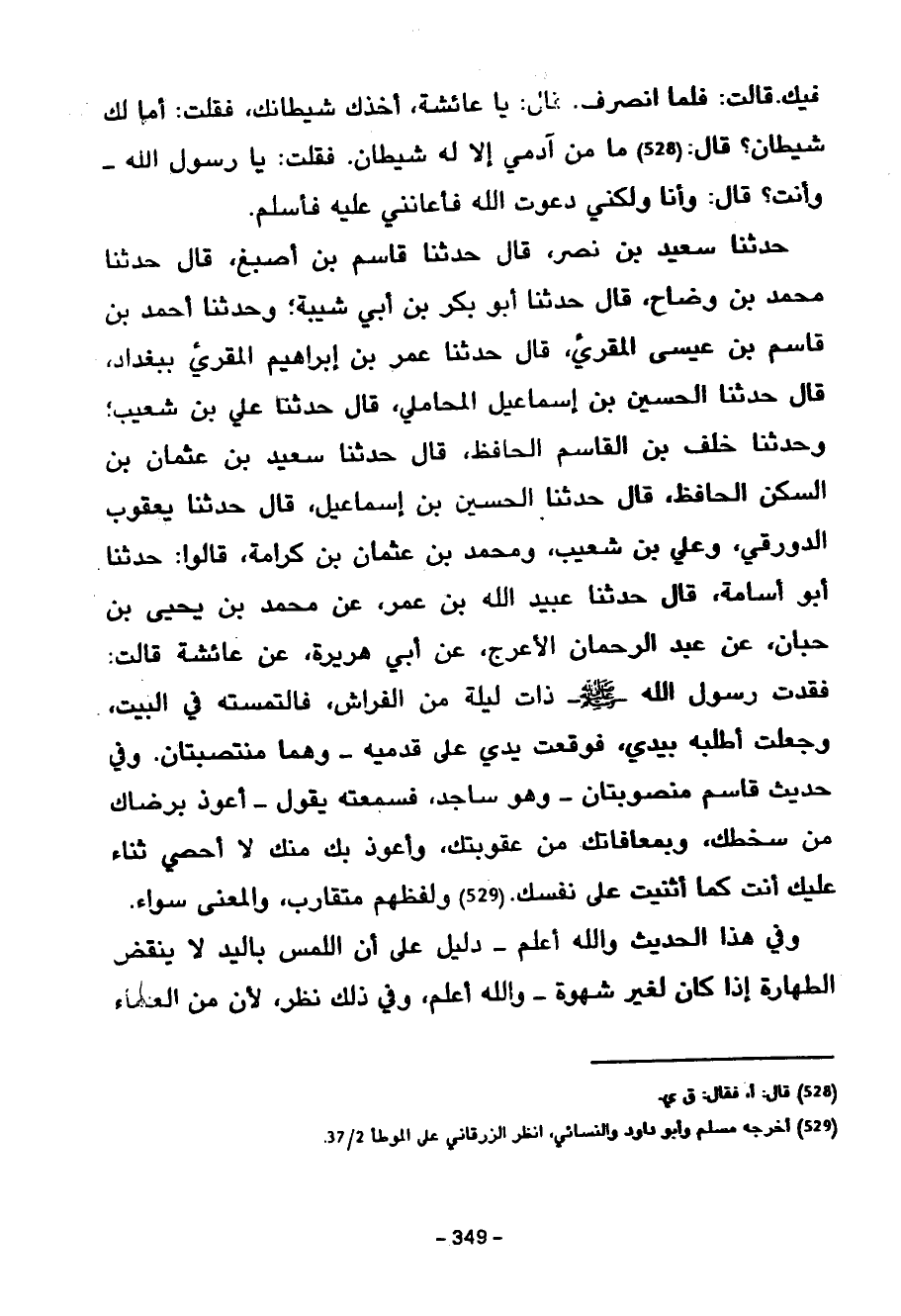 حَدَّثَنَا سَعِيدُ بْنُ نَصْرٍ قَالَ حَدَّثَنَا قَاسِمُ بْنُ أَصْبَغَ قَالَ حَدَّثَنَا مُحَمَّدُ بْنُ وَضَّاحٍ قَالَ حَدَّثَنَا أَبُو بَكْرِ بْنُ أَبِي شَيْبَةَ وَحَدَّثَنَا أَحْمَدُ بن قاسم بن عيسى المقريء قال حدثنا عمر بن إبراهيم المقريء بِبَغْدَادَ قَالَ حَدَّثَنَا الْحُسَيْنُ بْنُ إِسْمَاعِيلَ الْمَحَامِلِيُّ قَالَ حَدَّثَنَا عَلِيُّ بْنُ شُعَيْبٍ وَحَدَّثَنَا خَلَفُ بْنُ الْقَاسِمِ الْحَافِظُ قَالَ حَدَّثَنَا سَعِيدُ بْنُ عُثْمَانَ بْنِ السَّكَنِ الْحَافِظُ قَالَ حَدَّثَنَا الْحُسَيْنُ بْنُ إِسْمَاعِيلَ قَالَ حَدَّثَنَا يَعْقُوبُ الدَّوْرَقِيُّ وَعَلِيُّ بْنُ شُعَيْبٍ وَمُحَمَّدُ بْنُ عُثْمَانَ بْنِ كَرَامَةَ قَالُوا حَدَّثَنَا أَبُو أُسَامَةَ قَالَ حَدَّثَنَا عُبَيْدُ اللَّهِ بْنُ عُمَرَ عَنْ مُحَمَّدِ بْنِ يَحْيَى بْنِ حَبَّانَ عَنْ عَبْدِ الرَّحْمَنِ الْأَعْرَجِ عَنْ أَبِي هُرَيْرَةَ عَنِ عَائِشَةَ قَالَتْ فَقَدْتُ رَسُولُ اللَّهِ صَلَّى اللَّهُ عَلَيْهِ وَسَلَّمَ ذَاتَ لَيْلَةٍ مِنَ الْفِرَاشِ فَالْتَمَسْتُهُ فِي الْبَيْتِ وَجَعَلْتُ أَطْلُبُهُ بِيَدِي فَوَقَعَتْ يَدِي عَلَى قَدَمَيْهِ وَهُمَا مُنْتَصِبَتَانِ