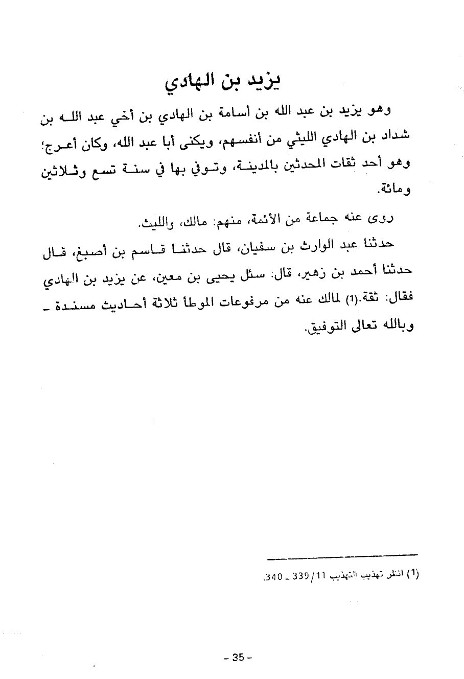 يَزِيدُ بْنُ الْهَادِي وَهُوَ يَزِيدَ بْنِ عَبْدِ اللَّهِ بْنِ أُسَامَةَ بْنِ الْهَادِي ابْنُ أَخِي عَبْدِ اللَّهِ بْنِ شَدَّادٍ الْهَادِي اللَّيْثِيِّ مِنْ أَنْفُسِهِمْ وَيُكَنَّى أَبَا عَبْدِ اللَّهِ وَكَانَ أَعْرَجَ وهو أحد ثقات المحدثين مو بِالْمَدِينَةِ وَتُوفِّيَ بِهَا فِي سَنَةِ تِسْعٍ وَثَلَاثِينَ وَمِائَةٍ