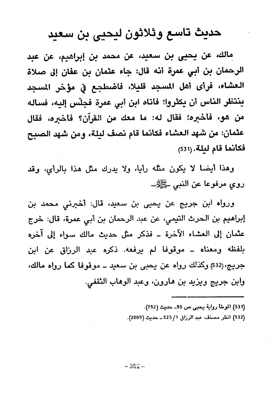 247 - مَالِكٌ عَنْ يَحْيَى بْنِ سَعِيدٍ عَنْ مُحَمَّدِ بْنِ إِبْرَاهِيمَ عَنْ عَبْدِ الرَّحْمَنِ بْنِ أَبِي عَمْرَةَ أَنَّهُ قَالَ جَاءَ عُثْمَانُ بْنُ عَفَّانَ إِلَى صَلَاةِ الْعِشَاءِ فَرَأَى أَهْلَ الْمَسْجِدِ قَلِيلًا فَاضْطَجَعَ فِي مُؤَخَّرِ الْمَسْجِدِ يَنْتَظِرُ النَّاسَ أَنْ يَكْثُرُوا فَأَتَاهُ ابْنُ أَبِي عَمْرَةَ فَجَلَسَ إِلَيْهِ فَسَأَلَهُ مَنْ هُوَ فَأَخْبَرَهُ فَقَالَ لَهُ مَا مَعَكَ مِنَ الْقُرْآنِ فَأَخْبَرَهُ فَقَالَ عُثْمَانُ مَنْ شَهِدَ الْعِشَاءَ فَكَأَنَّمَا قَامَ نِصْفَ لَيْلَةٍ وَمَنْ شَهِدَ الصُّبْحَ فَكَأَنَّمَا قَامَ لَيْلَةً