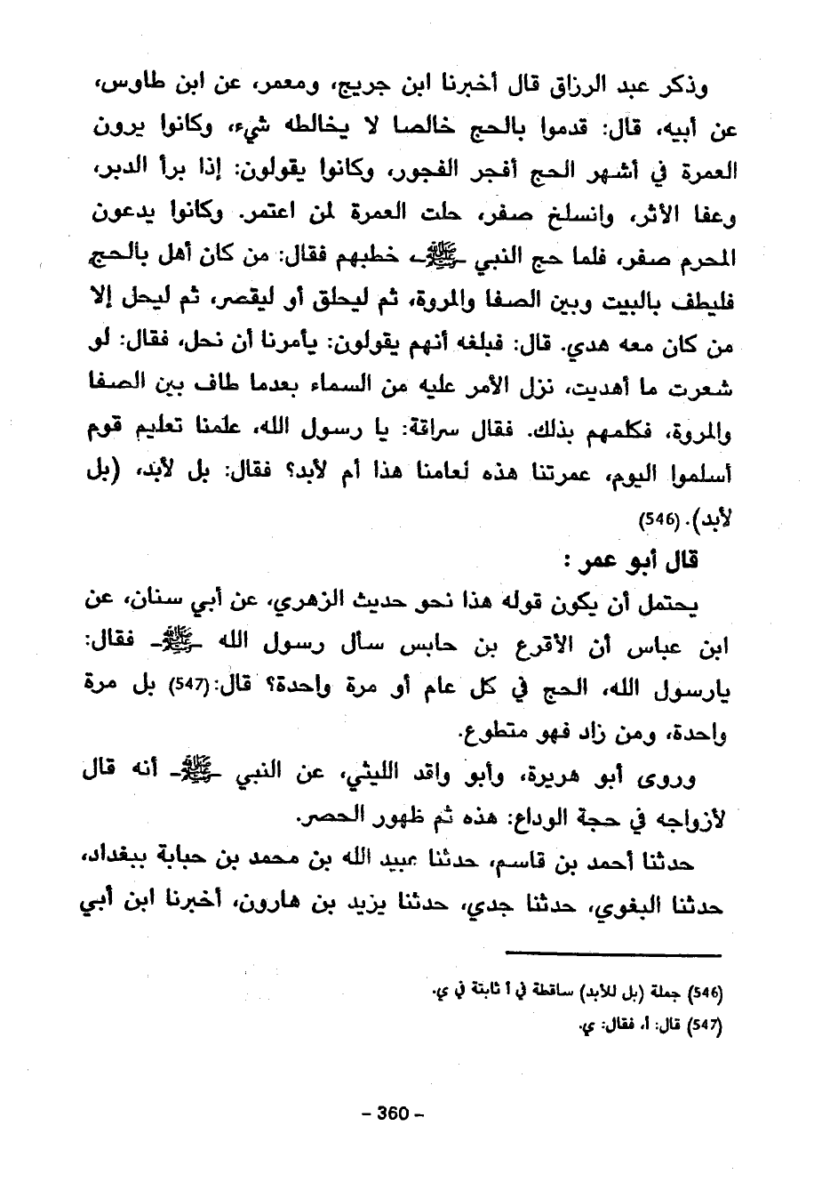 فَقَالَ سُرَاقَةُ يَا رَسُولَ اللَّهِ عَلِّمْنَا تَعْلِيمَ قَوْمٍ أَسْلَمُوا الْيَوْمَ عُمْرَتُنَا هَذِهِ لِعَامِنَا هَذَا أَمْ لِأَبَدٍ فَقَالَ بَلْ لِأَبَدٍ بَلْ لِأَبَدٍ