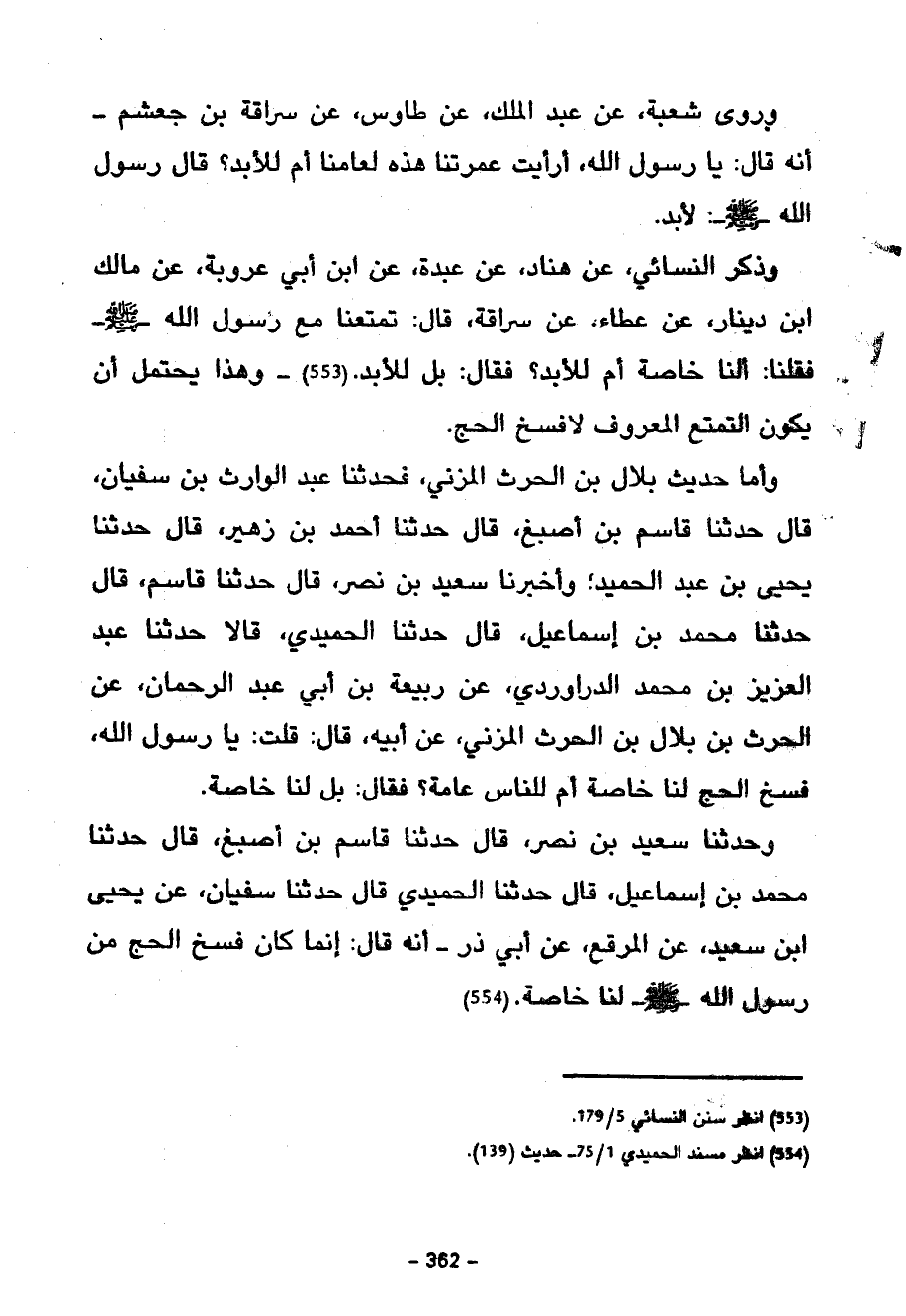 وَذَكَرَ النَّسَائِيُّ عَنْ هَنَّادٍ عَنْ عَبْدَةَ عَنِ ابْنِ أَبِي عَرُوبَةَ عَنْ مَالِكِ ابن دِينَارٍ عَنْ عَطَاءٍ عَنْ سُرَاقَةَ قَالَ تَمَتَّعْنَا مَعَ رَسُولِ اللَّهِ صَلَّى اللَّهُ عَلَيْهِ وَسَلَّمَ فَقُلْنَا أَلَنَا خَاصَّةً أَمْ لِلْأَبَدِ فَقَالَ بَلْ لِلْأَبَدِ