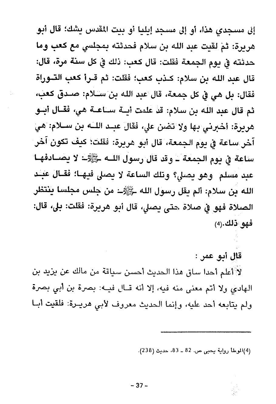 يَشُكُّ قَالَ أَبُو هُرَيْرَةَ ثُمَّ لَقِيْتُ عَبْدَ اللَّهِ بْنَ سَلَامٍ فَحَدَّثْتُهُ بِمَجْلِسِي مَعَ كَعْبٍ وَمَا حَدَّثْتُهُ فِي يَوْمِ الْجُمْعَةِ فَقُلْتُ قَالَ كَعْبٌ ذَلِكَ فِي كُلِّ سَنَةٍ مَرَّةً قَالَ قَالَ عَبْدُ اللَّهِ بْنُ سَلَامٍ كَذَبَ كَعْبٌ فَقُلْتُ ثُمَّ قَرَأَ كَعْبٌ التَّوْرَاةَ فَقَالَ بَلْ هِيَ فِي كُلِّ جُمْعَةٍ قَالَ عَبْدُ اللَّهِ بْنُ سَلَامٍ صَدَقَ كَعْبٌ ثُمَّ قَالَ عَبْدُ اللَّهِ بْنُ سَلَامٍ قَدْ عَلِمْتُ أَيَّةَ سَاعَةٍ هِيَ فَقَالَ أَبُو هُرَيْرَةَ أَخْبِرْنِي بِهَا وَلَا تَضِنَّ عَلَيَّ فَقَالَ عَبْدُ اللَّهِ بْنُ سَلَامٍ هِيَ آخِرُ سَاعَةٍ فِي يوم الجمعة وقد قال رسول الله لَا يُصَادِفُهَا عَبْدٌ مُسْلِمٌ وَهُوَ يُصَلِّي وَتِلْكَ السَّاعَةُ لَا يُصَلَّى فِيهَا فَقَالَ عَبْدُ اللَّهِ بْنُ سَلَامٍ أَلَمْ يَقُلْ رَسُولُ اللَّهِ مَنْ جَلَسَ مَجْلِسًا يَنْتَظِرُ الصَّلَاةَ فَهُوَ فِي صَلَاةٍ حَتَّى يُصَلِّيَ قَالَ أَبُو هُرَيْرَةَ فَقُلْتُ بَلَى قَالَ فَهُوَ ذَلِكَ