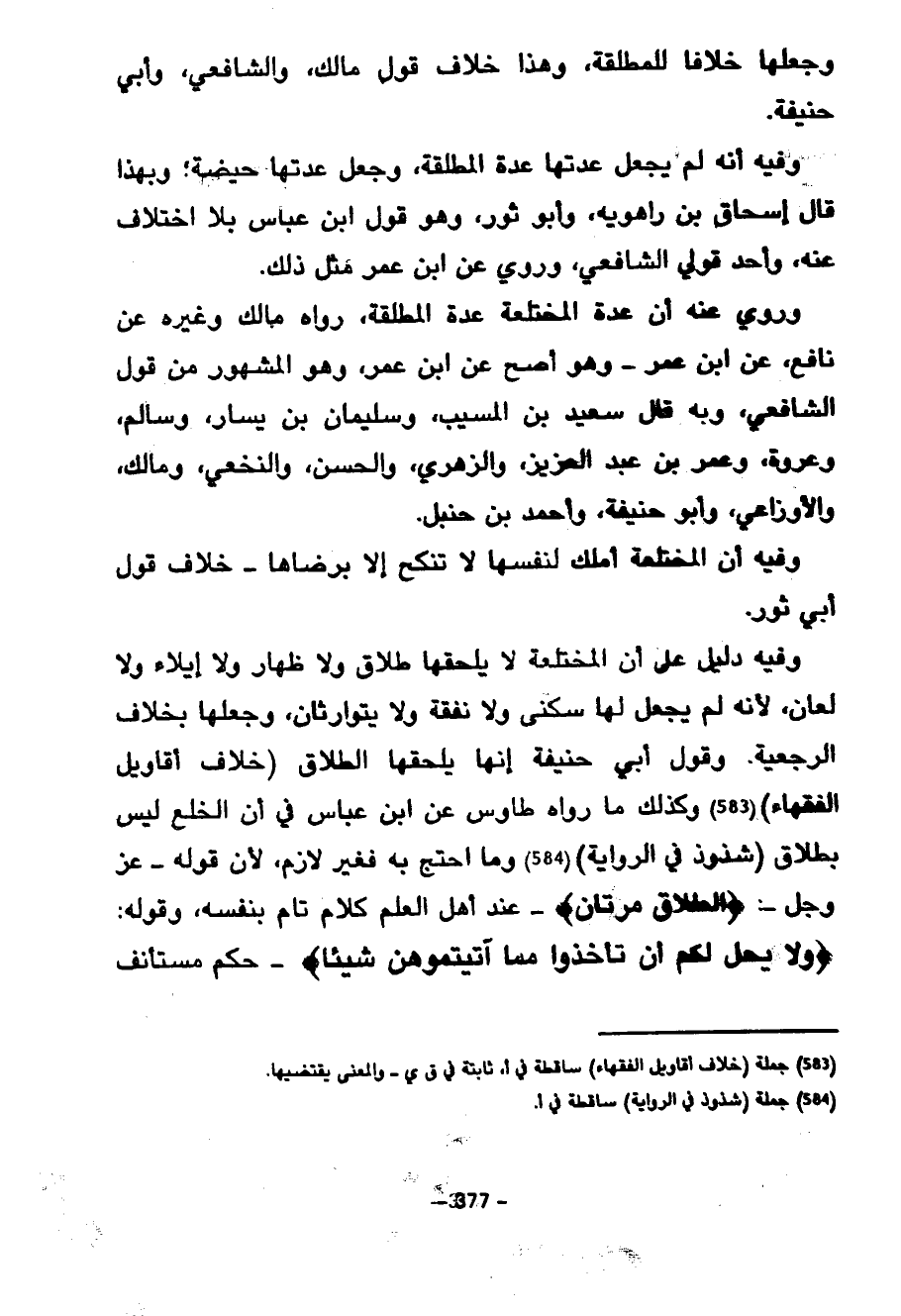 وَقَوْلُ أَبِي حَنِيفَةَ إِنَّهَا يَلْحَقُهَا الطَّلَاقُ خِلَافُ أَقَاوِيلِ الْفُقَهَاءِ وَكَذَلِكَ مَا رَوَاهُ طَاوُسٌ عَنِ ابْنِ عَبَّاسٍ في أن الخلع ليس بطرق شذوذ في الرواية وما احتج به فغير لَازِمٍ لِأَنَّ قَوْلَهُ عَزَّ وَجَلَّ الطَّلَاقُ مَرَّتَانِ عِنْدَ أَهْلِ الْعِلْمِ كَلَامٌ تَامٌّ بِنَفْسِهِ وَقَوْلُهُ وَلَا يَحِلُّ لَكُمْ أَنْ تَأْخُذُوا مِمَّا آتَيْتُمُوهُنَّ شَيْئًا حُكْمٌ مُسْتَأْنَفٌ